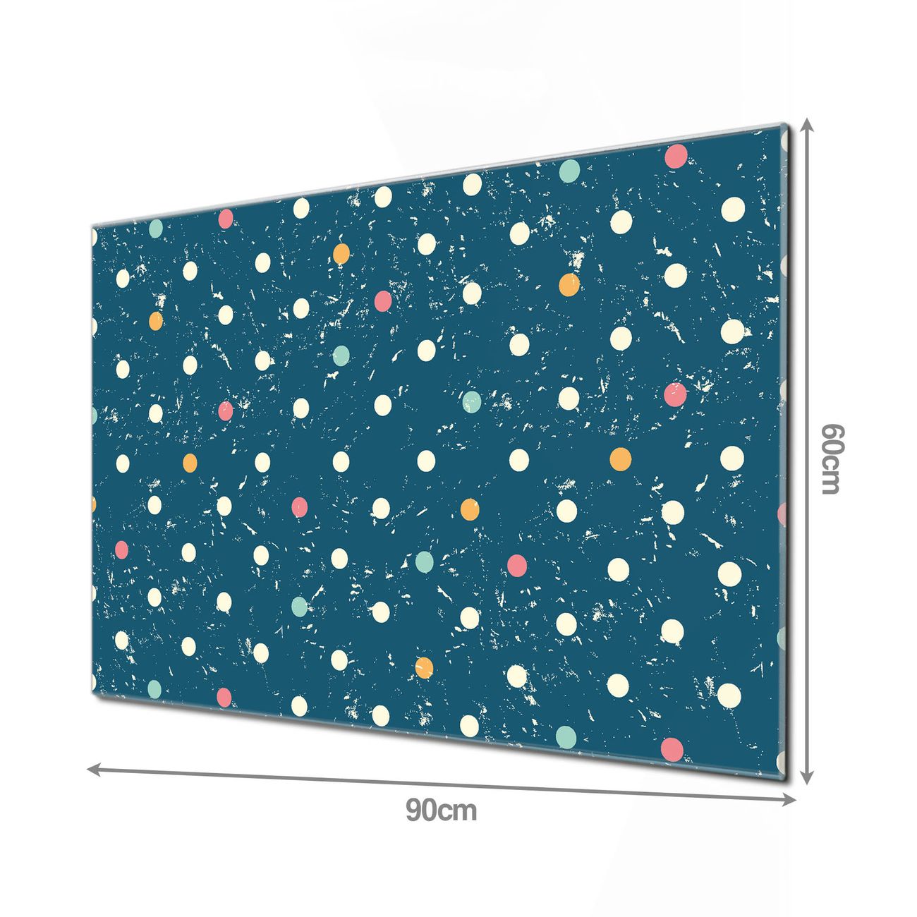 Material: 4mm Sicherheitsglas mit Metallrückwand Eigenschaften: beschreibbar, magnetisch, kratzfest Maße: 90x60x0,6cm, 8,10kg schwer Motiv Nummer 11681 Punkte auf Blau Zubehör: inklusive 4 Neodym-Magnete