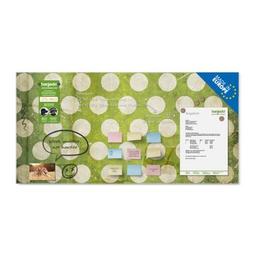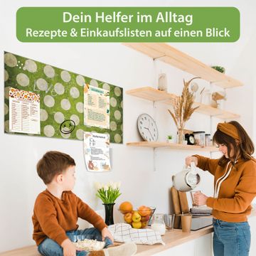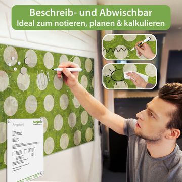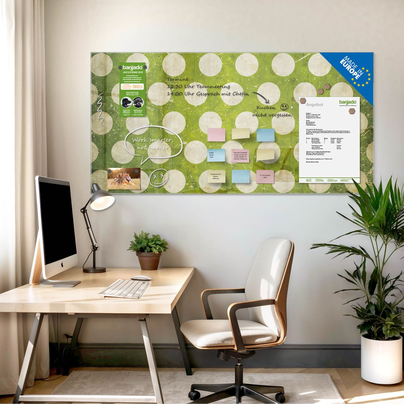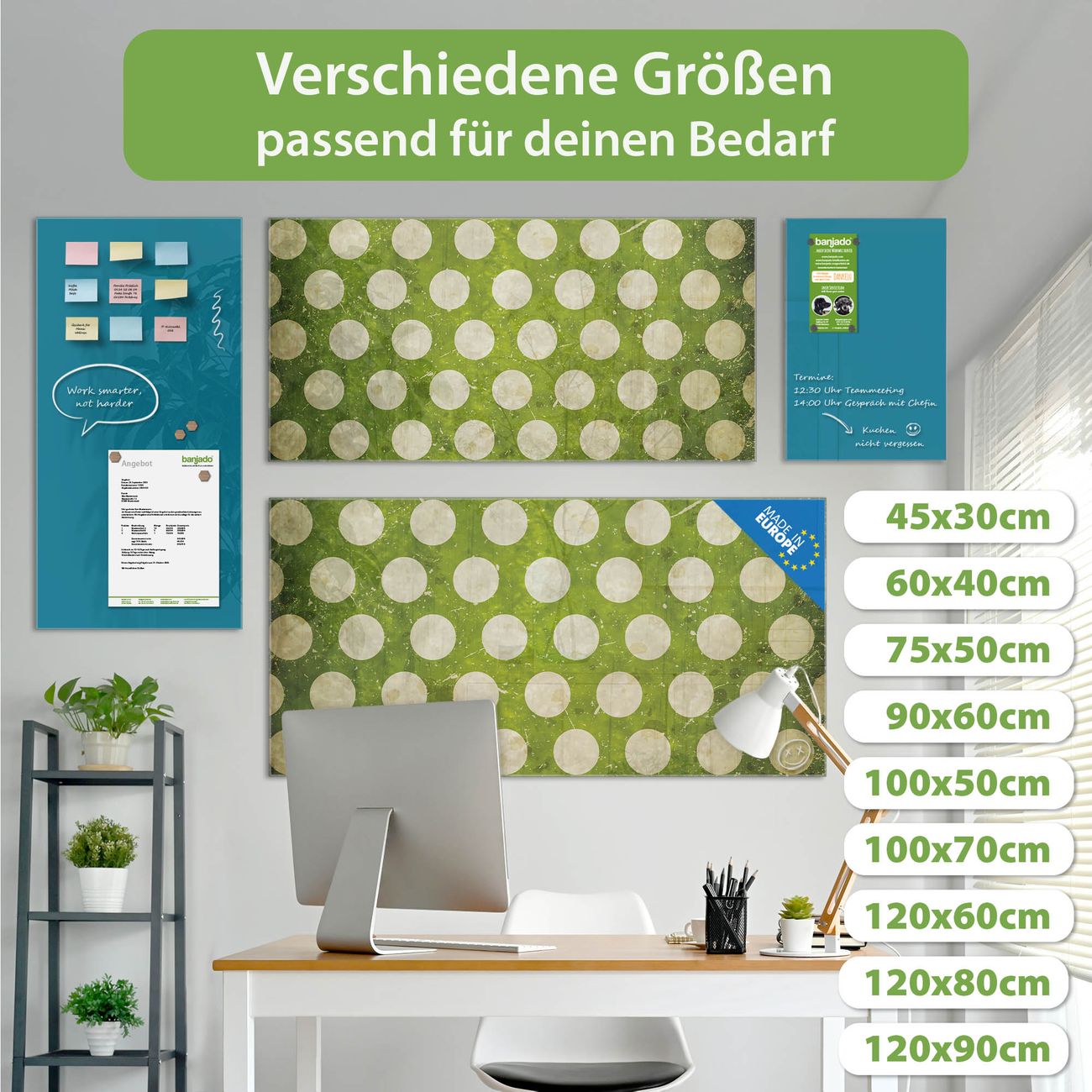 Material: 4mm Sicherheitsglas mit Metallrückwand Eigenschaften: beschreibbar, magnetisch, kratzfest Maße: 100x50x0,6cm, 7,50kg schwer Motiv Nummer 11267 Punkte Grün Vintage Zubehör: inklusive 4 Neodym-Magnete