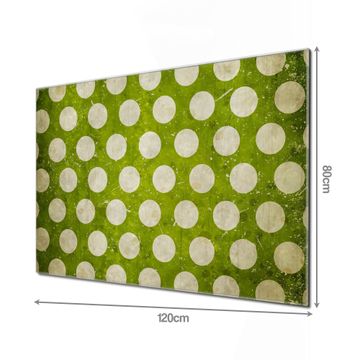Material: 4mm Sicherheitsglas mit Metallrückwand Eigenschaften: beschreibbar, magnetisch, kratzfest Maße: 120x80x0,6cm, 14,40kg schwer Motiv Nummer 11267 Punkte Grün Vintage Zubehör: inklusive 4 Neodym-Magnete