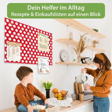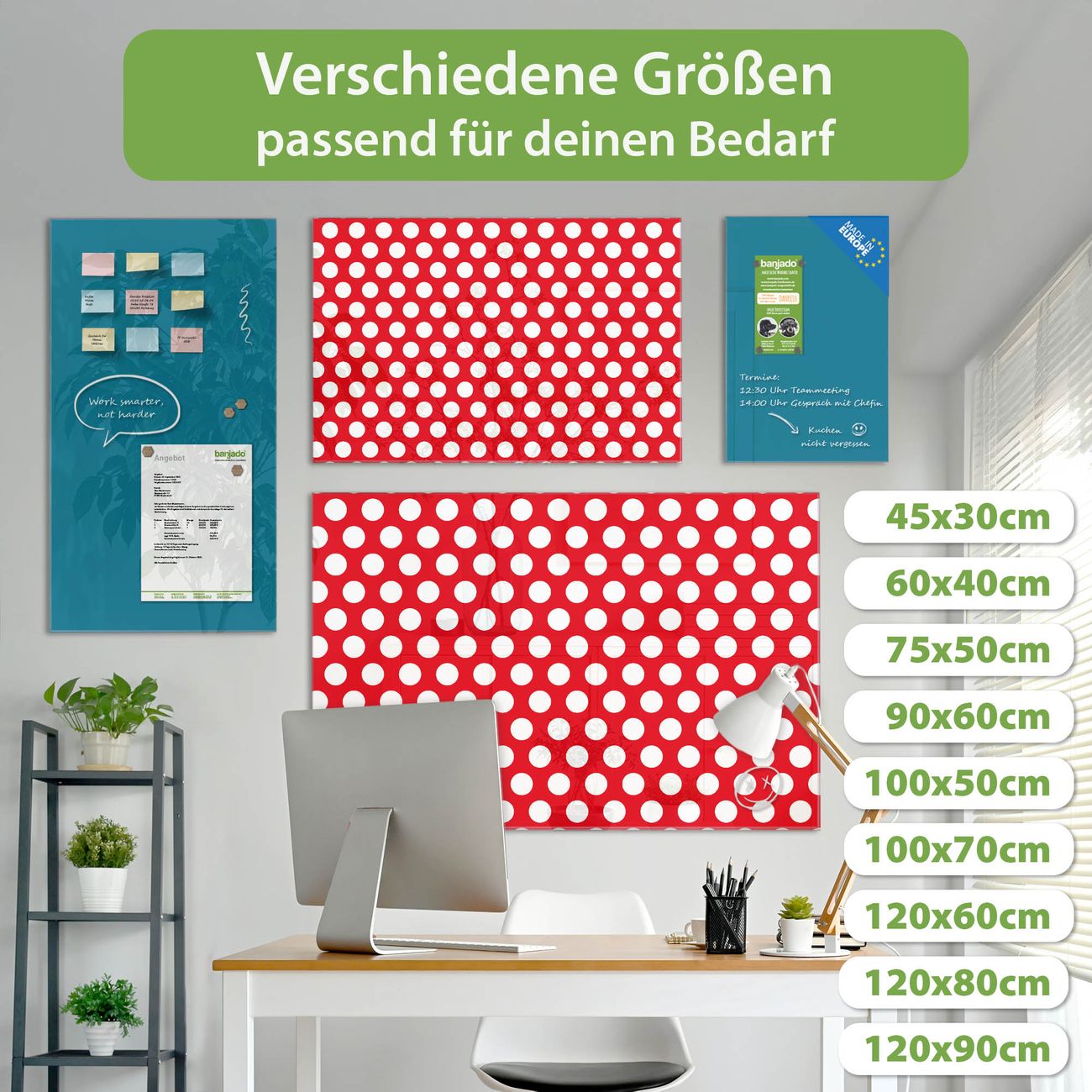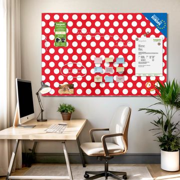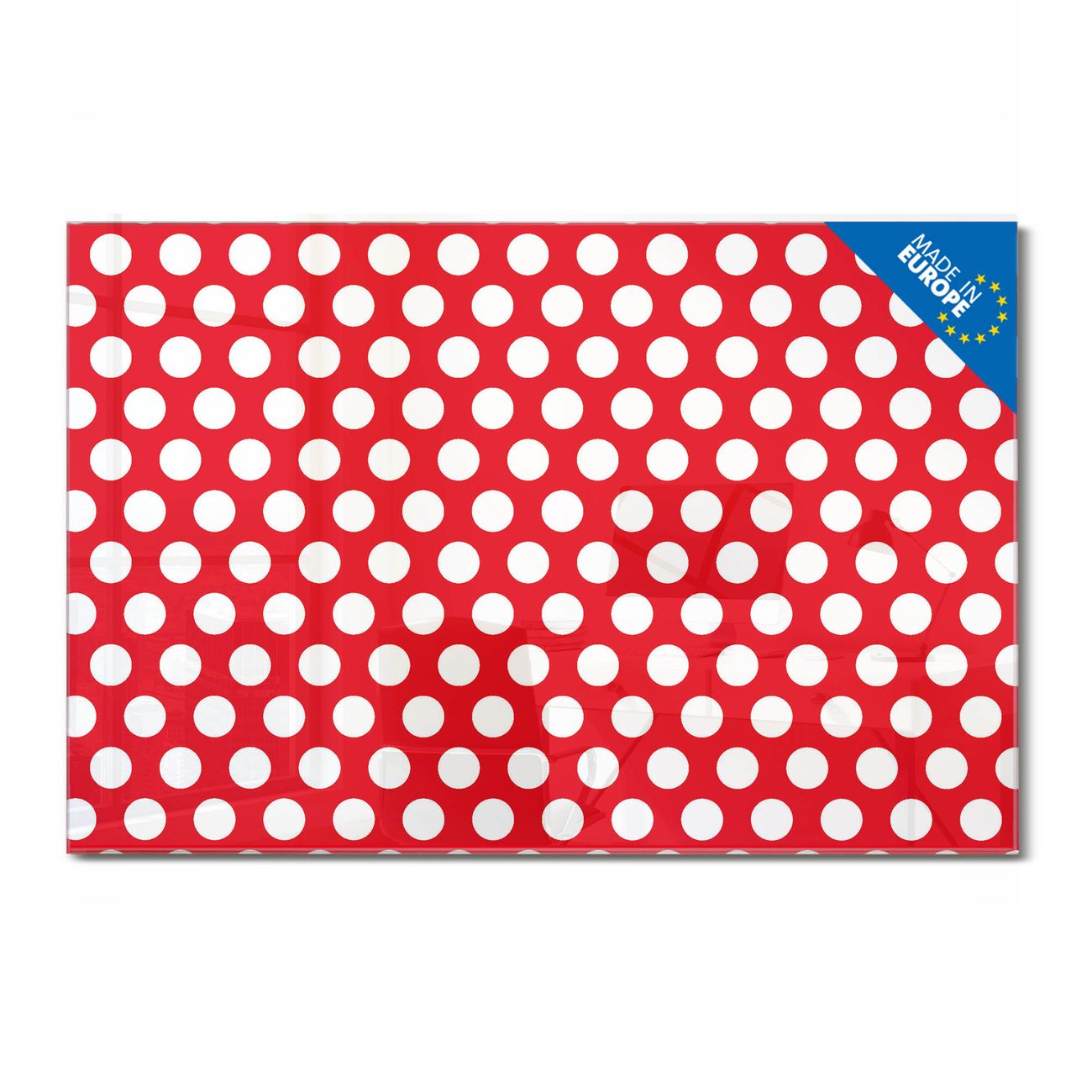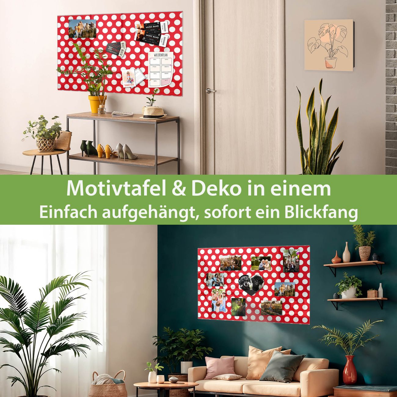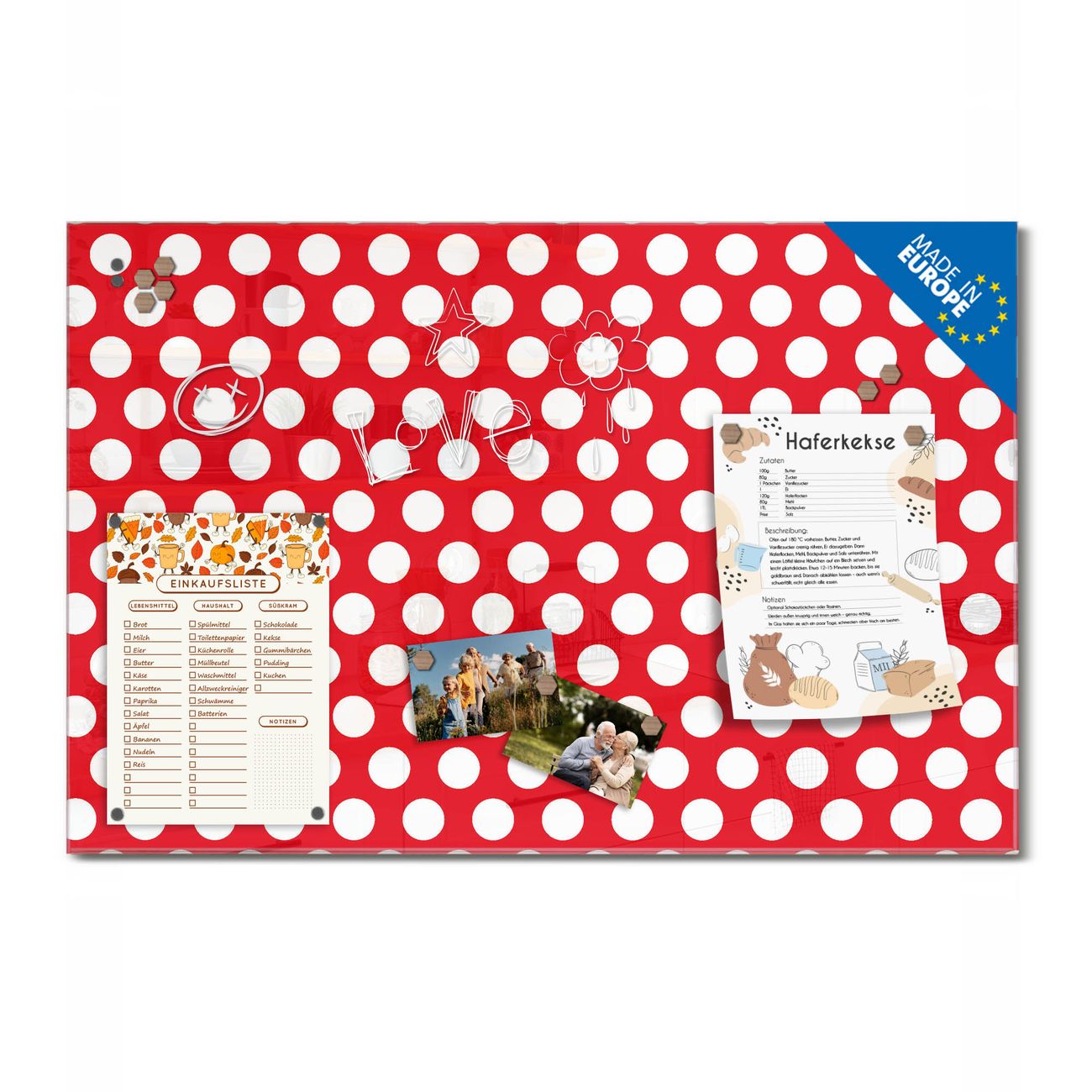 Material: 4mm Sicherheitsglas mit Metallrückwand Eigenschaften: beschreibbar, magnetisch, kratzfest Maße: 75x50x0,6cm, 5,63kg schwer Motiv Nummer 10588 Punkte Rot Zubehör: inklusive 4 Neodym-Magnete
