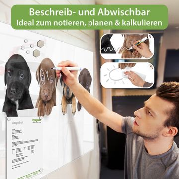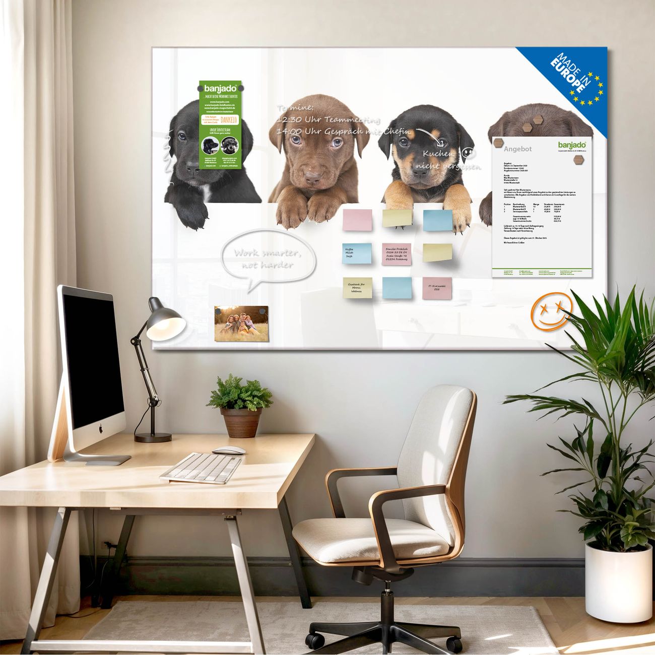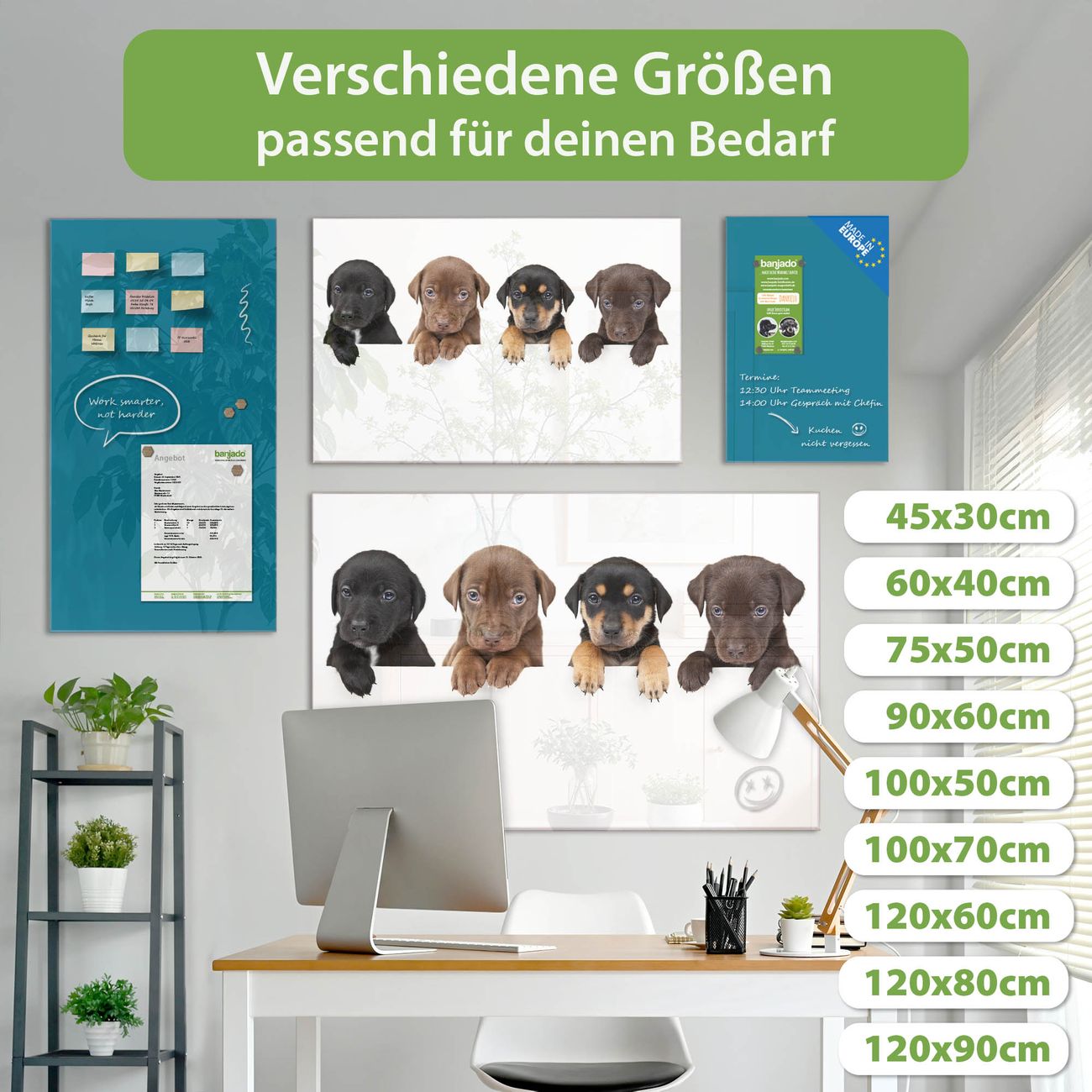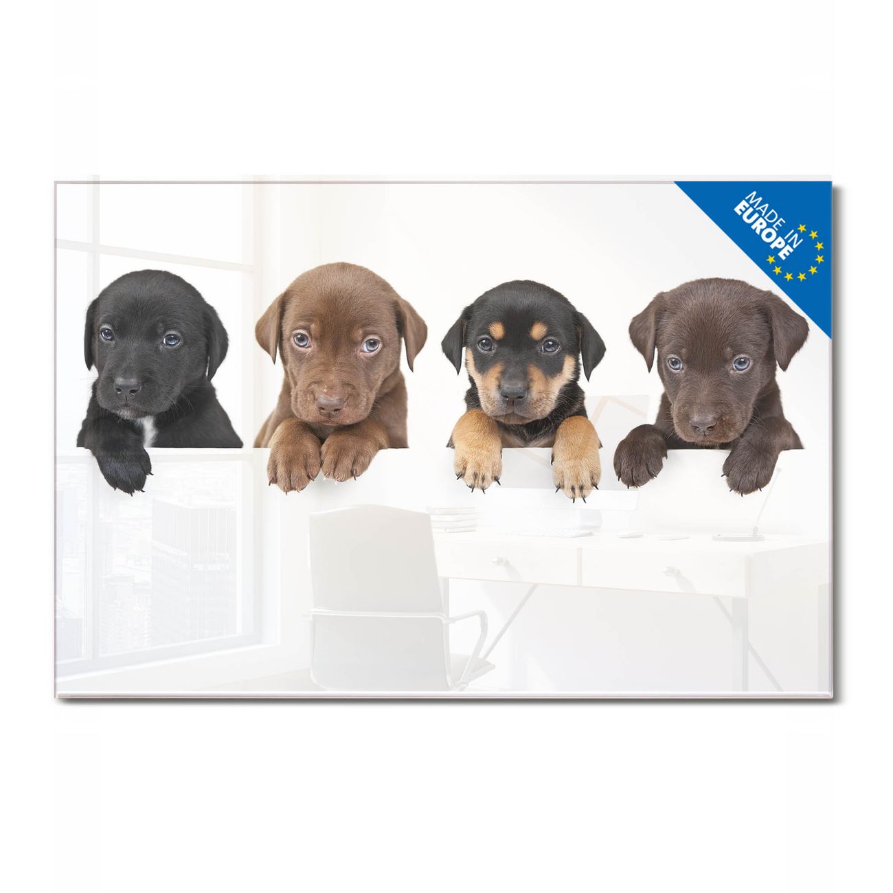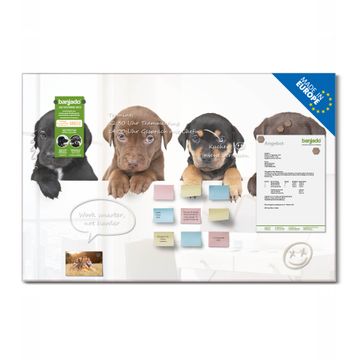Material: 4mm Sicherheitsglas mit Metallrückwand Eigenschaften: beschreibbar, magnetisch, kratzfest Maße: 120x80x0,6cm, 14,40kg schwer Motiv Nummer 10478 Puppies Zubehör: inklusive 4 Neodym-Magnete
