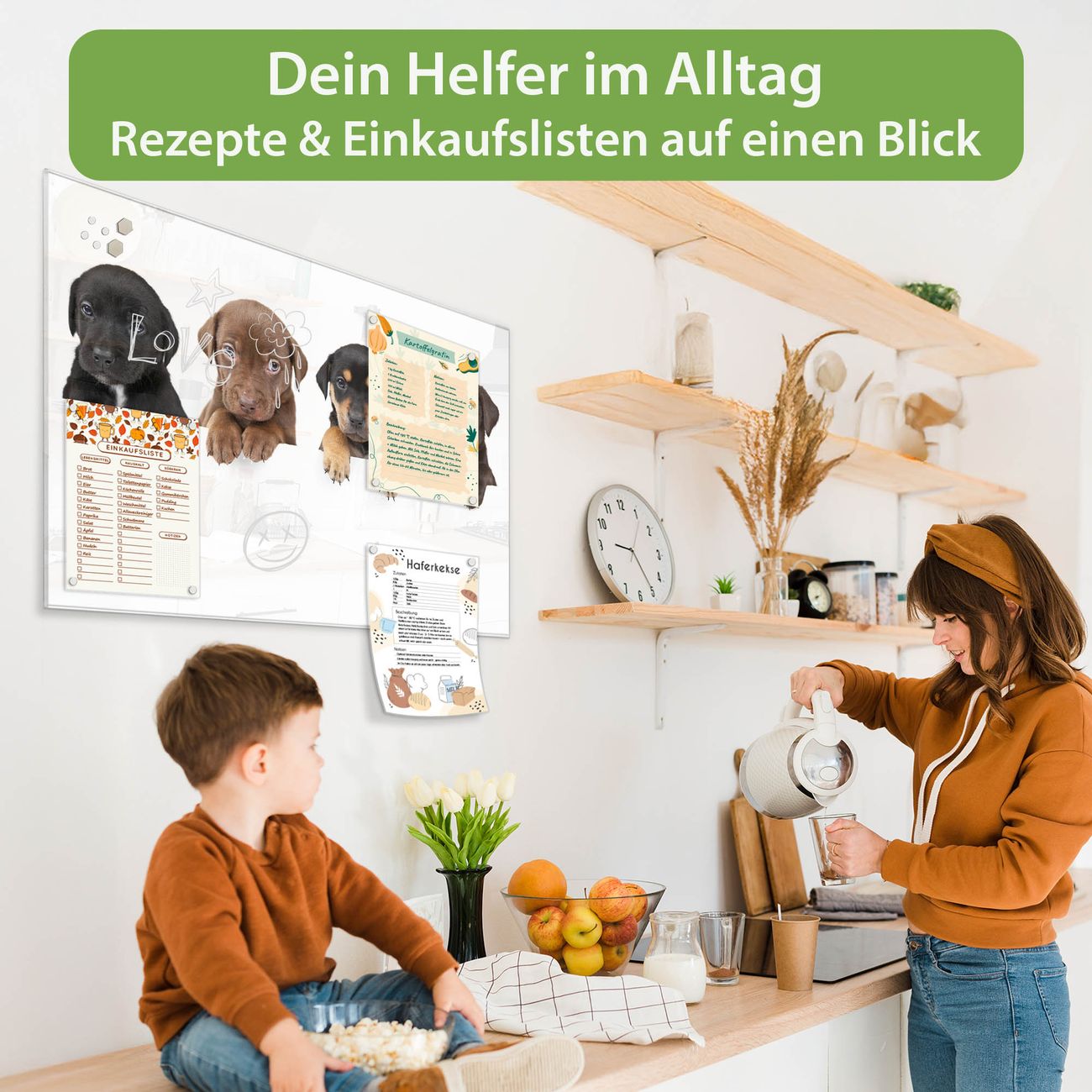 Ein Stück Design, das Ihren Alltag organisiert. Schreiben, heften, inspirieren - alles an einem Ort. Qualität, die man spürt. Montage leicht gemacht. Handwerk mit Herz - veredelt in Sachsen. Einzigartiges Design mit Motiv Motiv Puppies Beschreibbare Glasoberfläche, leicht zu reinigen Starke Magnetkraft durch Stahlrückwand Inklusive 4 Neodym-Magneten Flexible Montageoptionen Handveredelt in Sachsen - Qualität, die bleibt