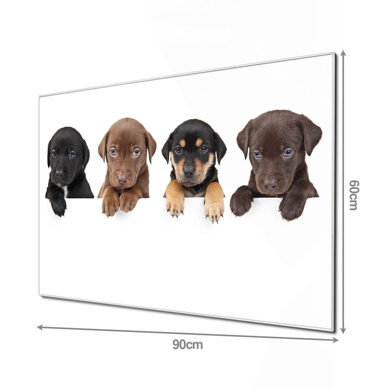 Material: 4mm Sicherheitsglas mit Metallrückwand Eigenschaften: beschreibbar, magnetisch, kratzfest Maße: 90x60x0,6cm, 8,10kg schwer Motiv Nummer 10478 Puppies Zubehör: inklusive 4 Neodym-Magnete