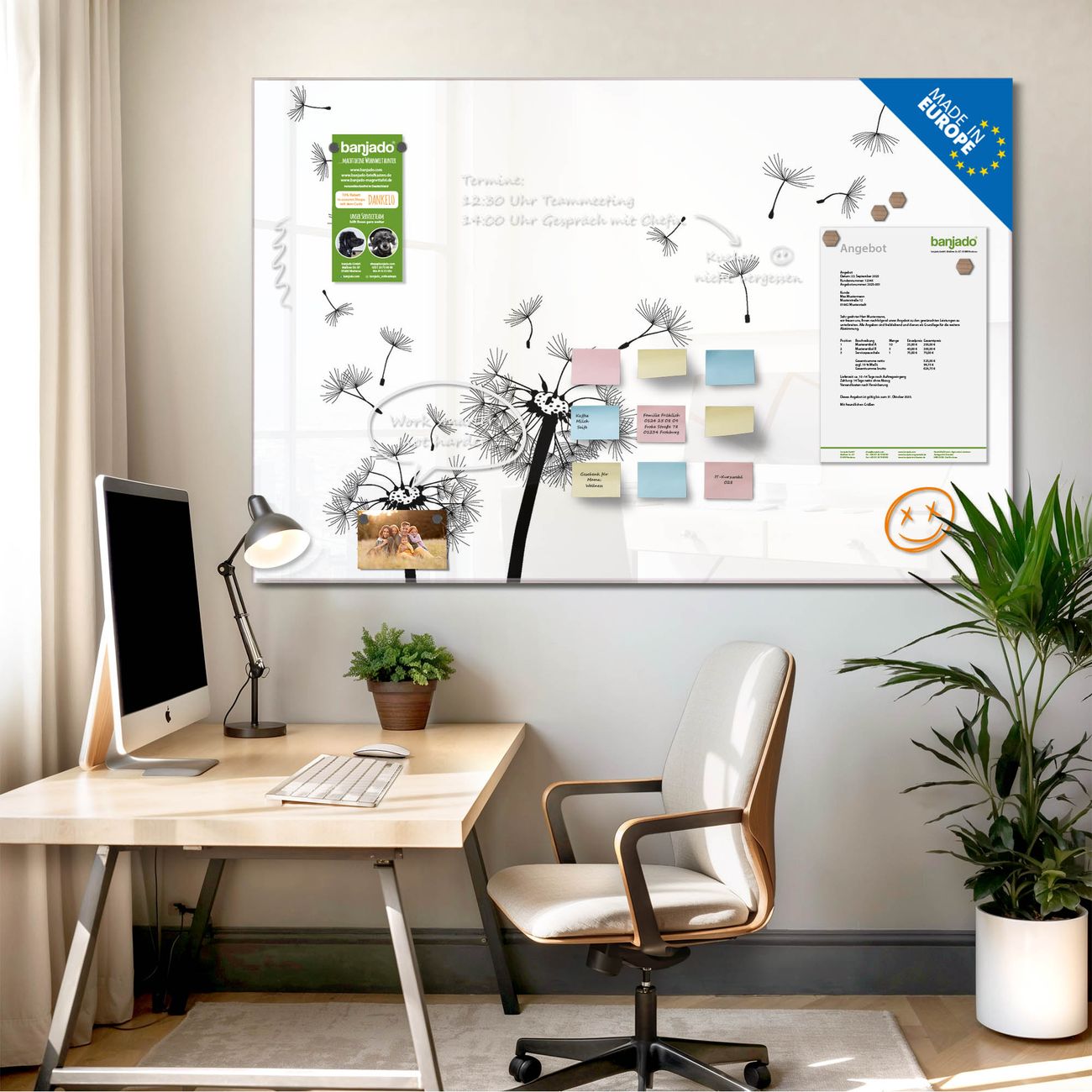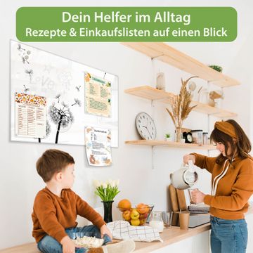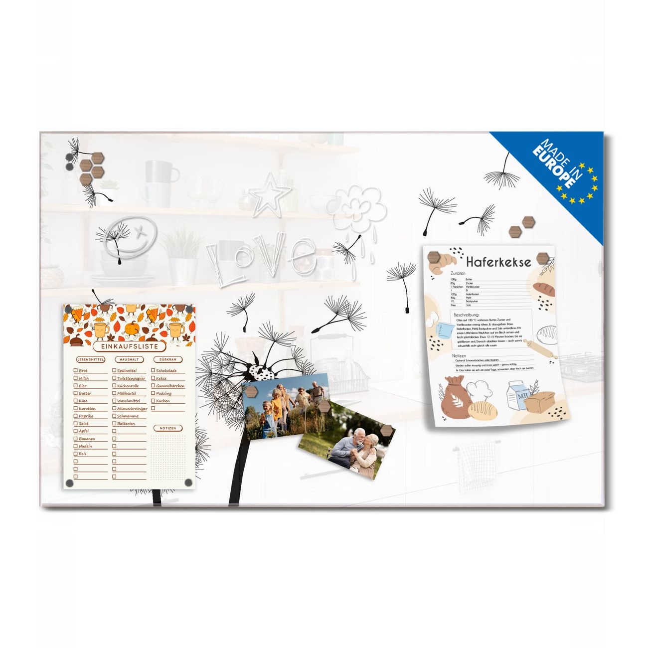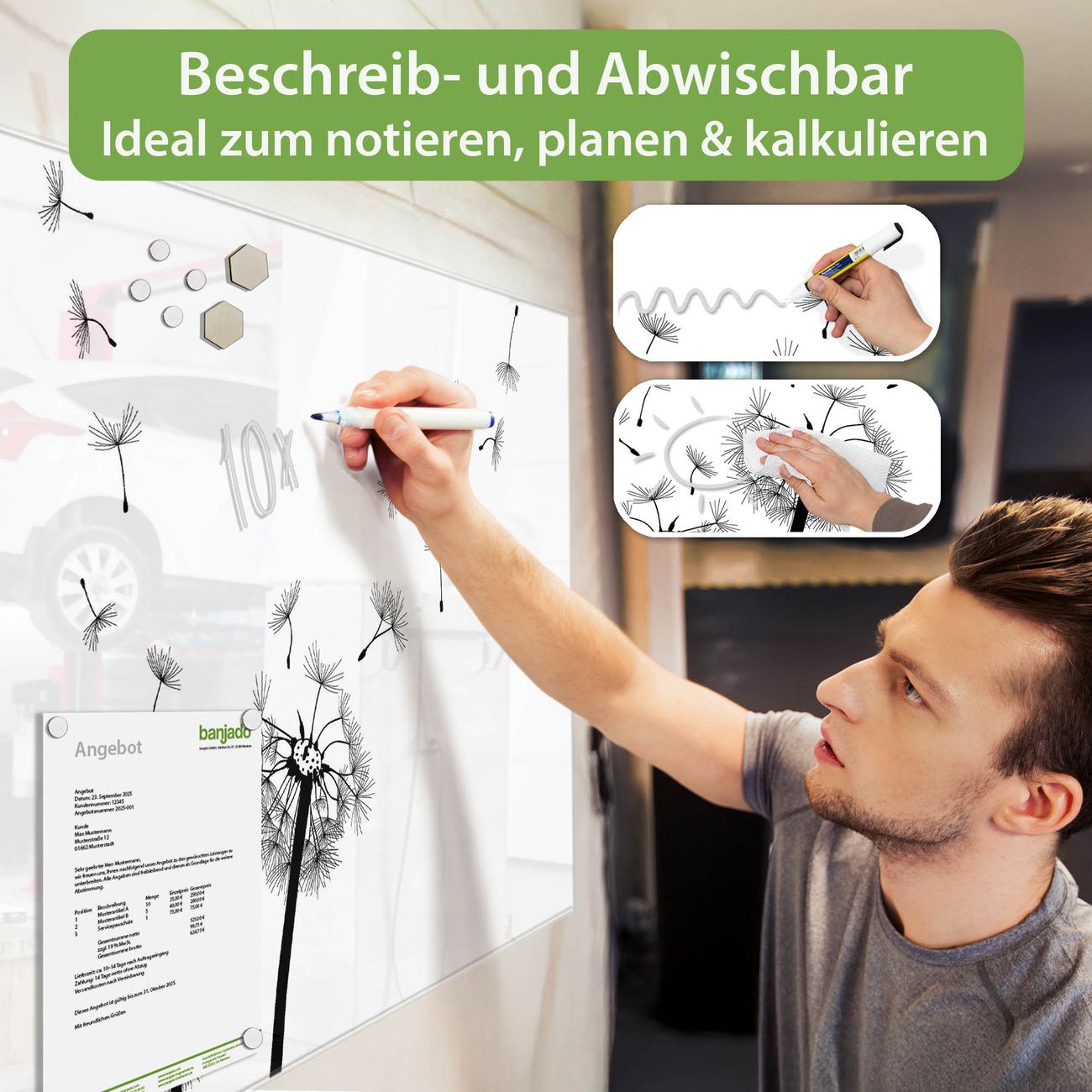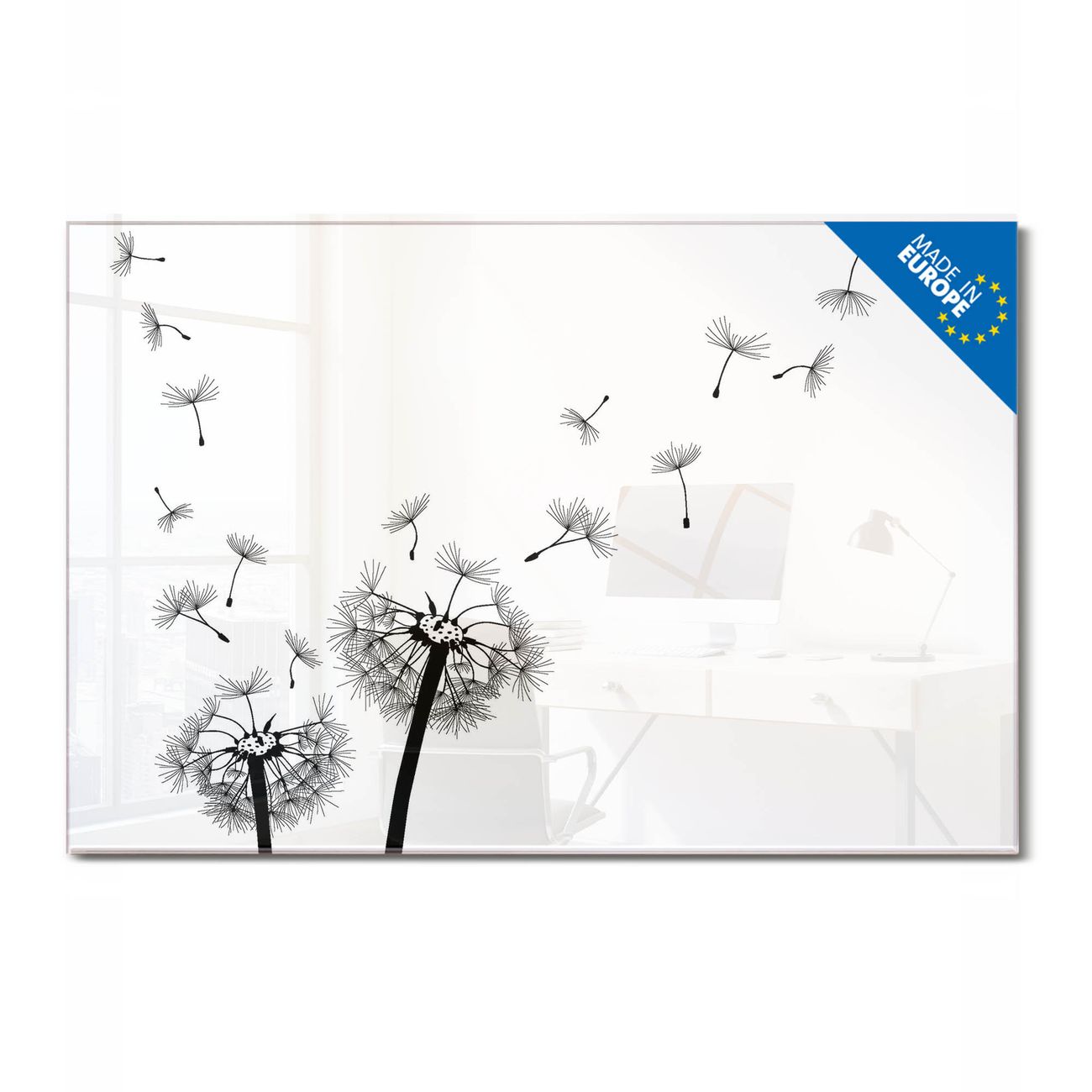 Material: 4mm Sicherheitsglas mit Metallrückwand Eigenschaften: beschreibbar, magnetisch, kratzfest Maße: 75x50x0,6cm, 5,63kg schwer Motiv Nummer 10361 Pusteblume 2 Zubehör: inklusive 4 Neodym-Magnete