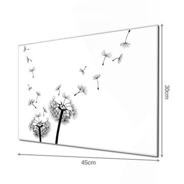 Material: 4mm Sicherheitsglas mit Metallrückwand Eigenschaften: beschreibbar, magnetisch, kratzfest Maße: 45x30x0,6cm, 2,03kg schwer Motiv Nummer 10361 Pusteblume 2 Zubehör: inklusive 4 Neodym-Magnete