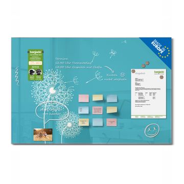 Material: 4mm Sicherheitsglas mit Metallrückwand Eigenschaften: beschreibbar, magnetisch, kratzfest Maße: 120x80x0,6cm, 14,40kg schwer Motiv Nummer 11123 Pusteblume 4 Zubehör: inklusive 4 Neodym-Magnete