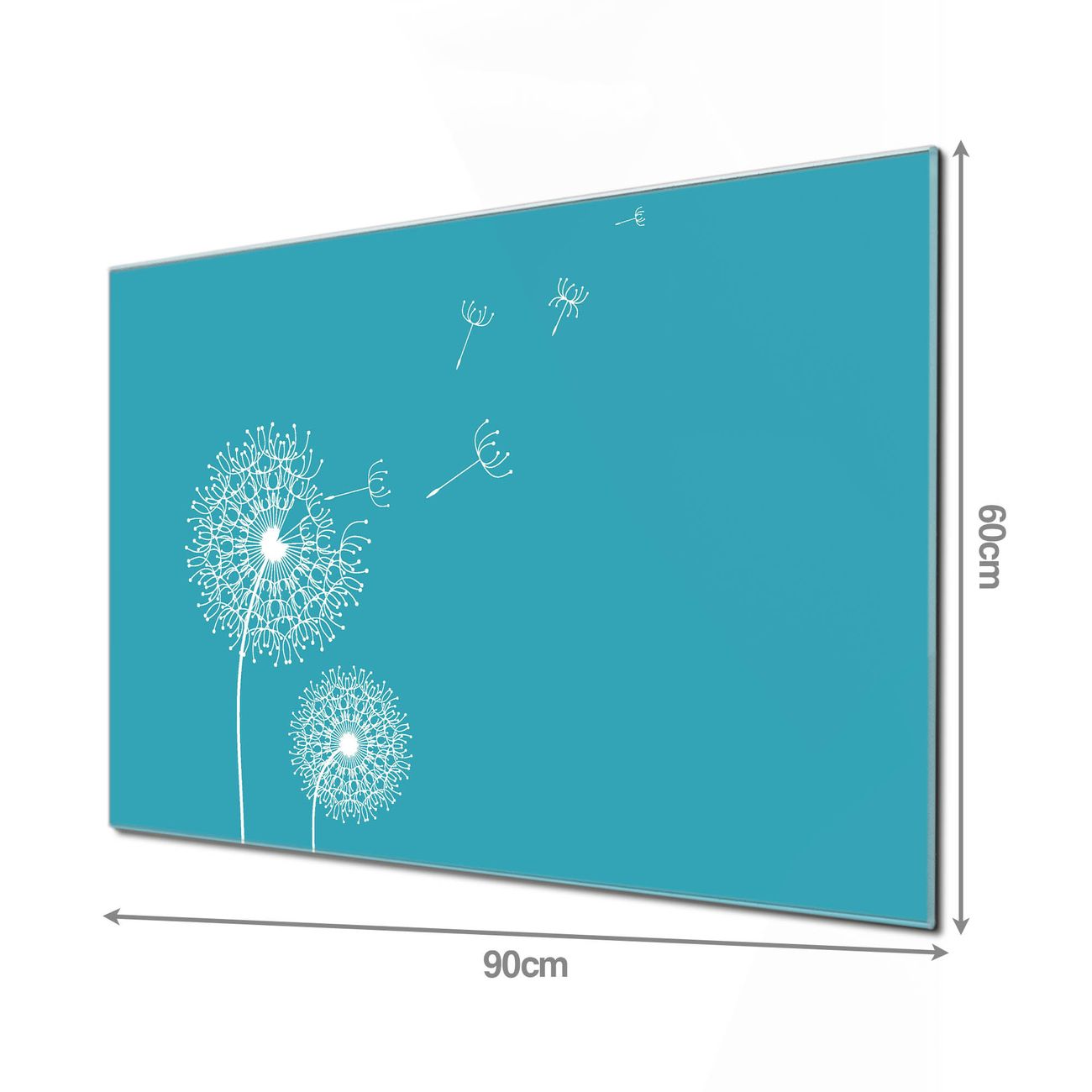 Material: 4mm Sicherheitsglas mit Metallrückwand Eigenschaften: beschreibbar, magnetisch, kratzfest Maße: 90x60x0,6cm, 8,10kg schwer Motiv Nummer 11123 Pusteblume 4 Zubehör: inklusive 4 Neodym-Magnete