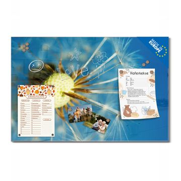 Material: 4mm Sicherheitsglas mit Metallrückwand Eigenschaften: beschreibbar, magnetisch, kratzfest Maße: 75x50x0,6cm, 5,63kg schwer Motiv Nummer 12281 Pusteblume Detail Zubehör: inklusive 4 Neodym-Magnete