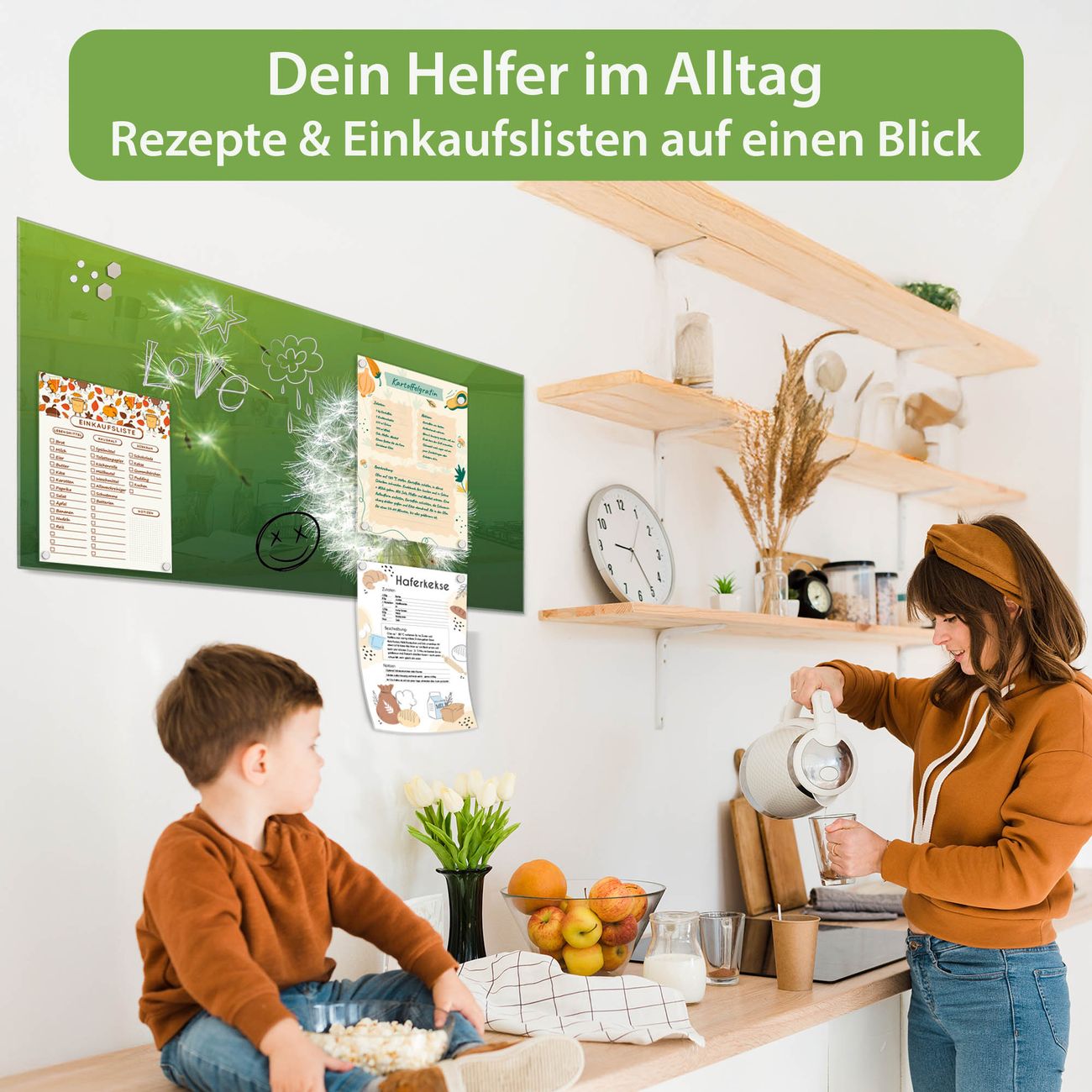 Auf der glatten Glasoberfläche lassen sich Termine, Rezepte oder Notizen ganz einfach mit Kreidestiften festhalten und rückstandslos entfernen. Starke Neodym-Magnete halten Ihre wichtigsten Erinnerungen sicher an Ort und Stelle. So entsteht Ihre ganz persönliche Ideenwand - jeden Tag neu.