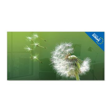 Material: 4mm Sicherheitsglas mit Metallrückwand Eigenschaften: beschreibbar, magnetisch, kratzfest Maße: 120x60x0,6cm, 10,80kg schwer Motiv Nummer 10074 Pusteblume Zubehör: inklusive 4 Neodym-Magnete
