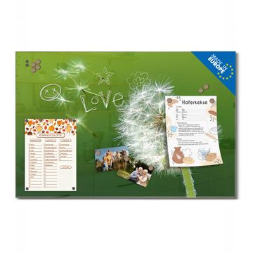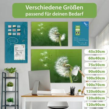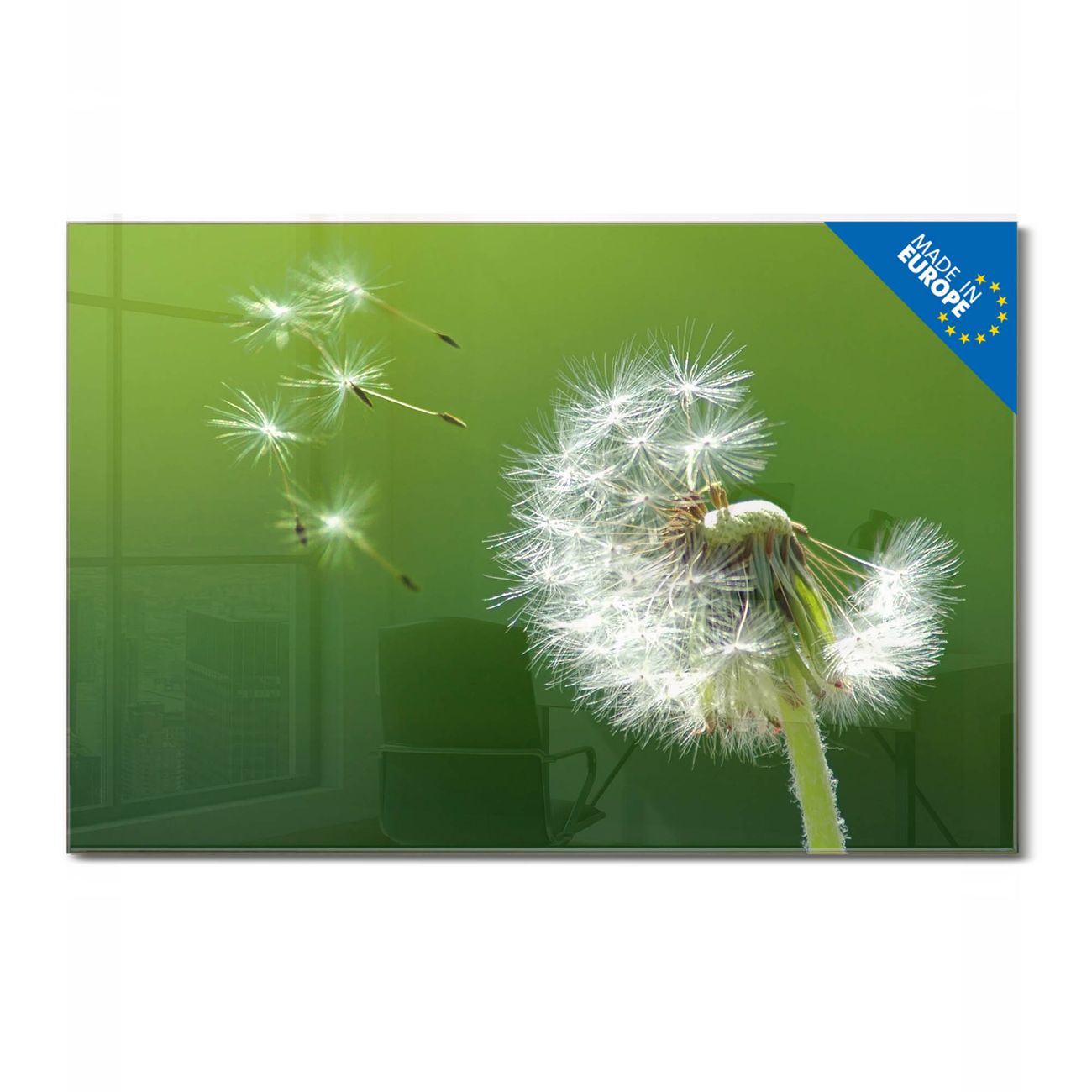 Material: 4mm Sicherheitsglas mit Metallrückwand Eigenschaften: beschreibbar, magnetisch, kratzfest Maße: 75x50x0,6cm, 5,63kg schwer Motiv Nummer 10074 Pusteblume Zubehör: inklusive 4 Neodym-Magnete