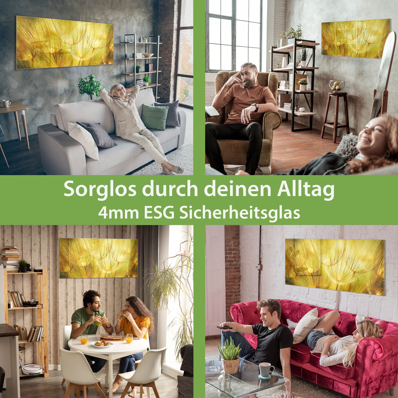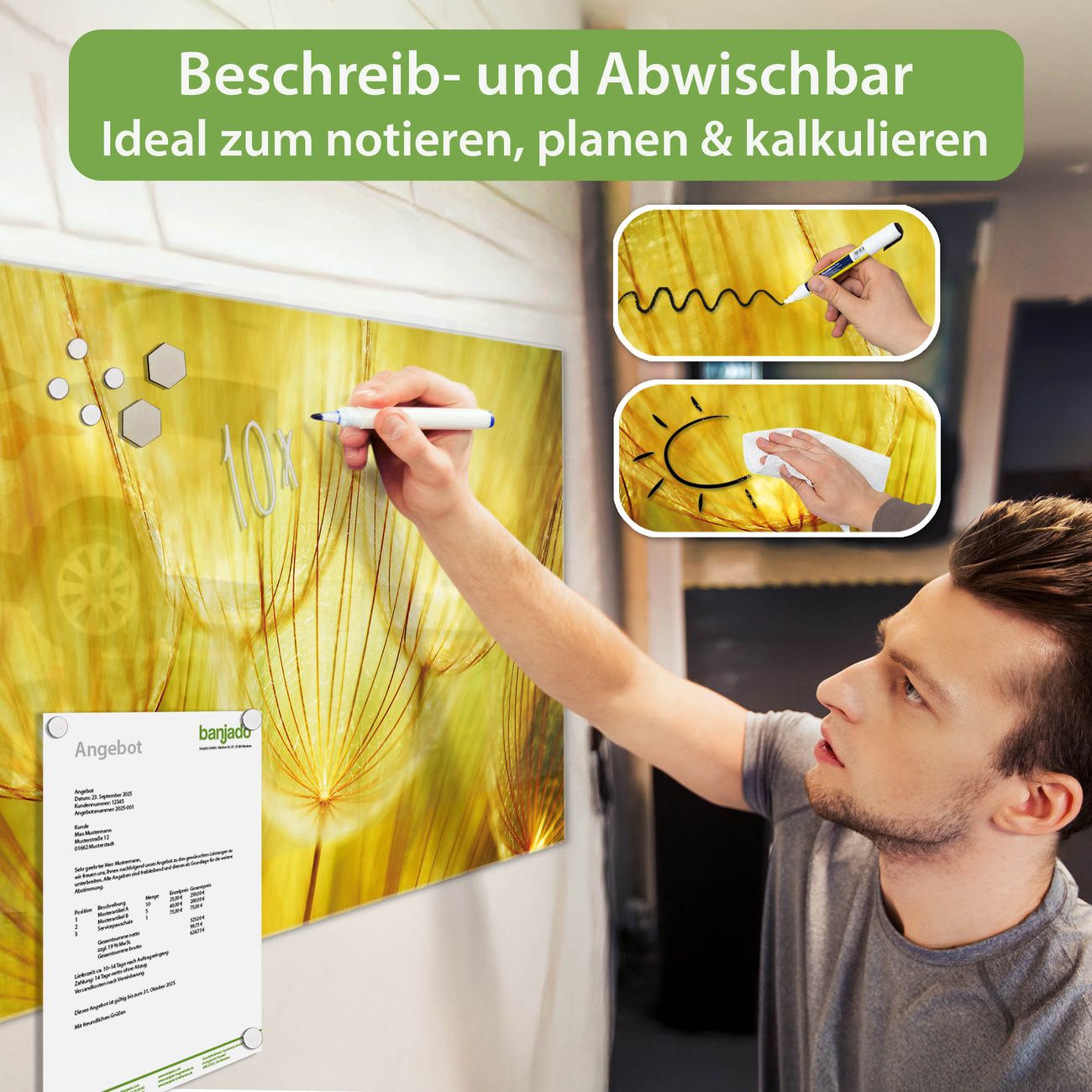 Material: 4mm Sicherheitsglas mit Metallrückwand Eigenschaften: beschreibbar, magnetisch, kratzfest Maße: 120x60x0,6cm, 10,80kg schwer Motiv Nummer 12265 Pusteblumen Gold Zubehör: inklusive 4 Neodym-Magnete