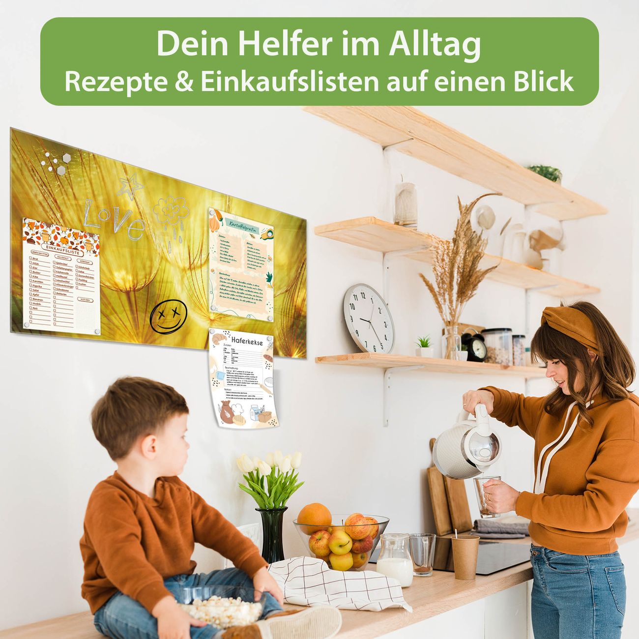 Ein Stück Design, das Ihren Alltag organisiert. Schreiben, heften, inspirieren - alles an einem Ort. Qualität, die man spürt. Montage leicht gemacht. Handwerk mit Herz - veredelt in Sachsen. Einzigartiges Design mit Motiv Motiv Pusteblumen Gold Beschreibbare Glasoberfläche, leicht zu reinigen Starke Magnetkraft durch Stahlrückwand Inklusive 4 Neodym-Magneten Flexible Montageoptionen Handveredelt in Sachsen - Qualität, die bleibt