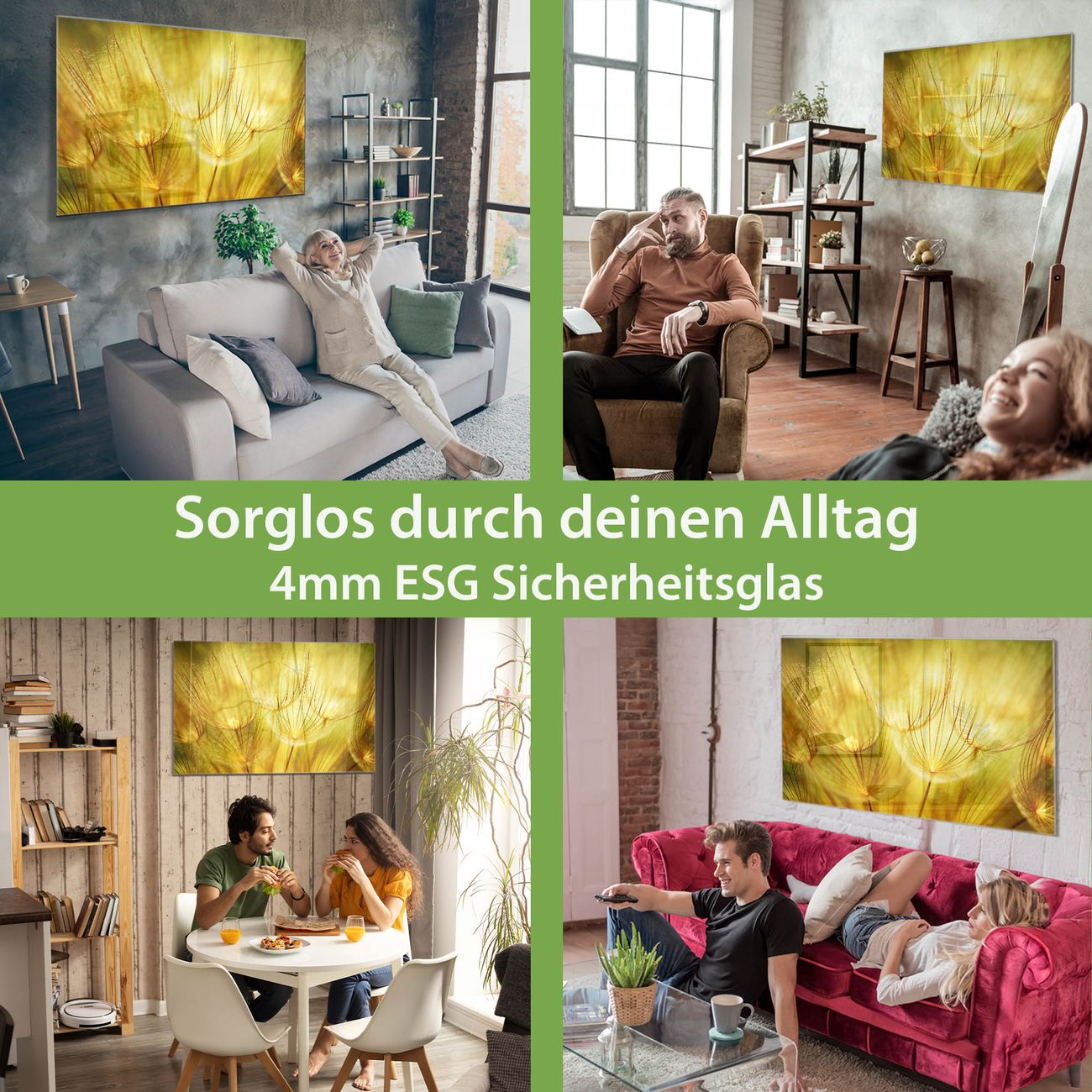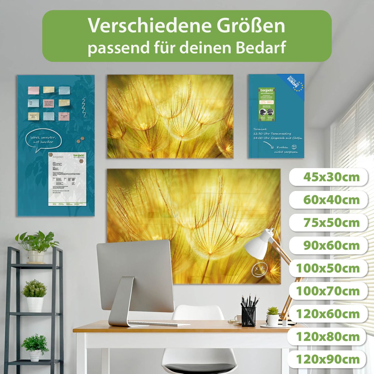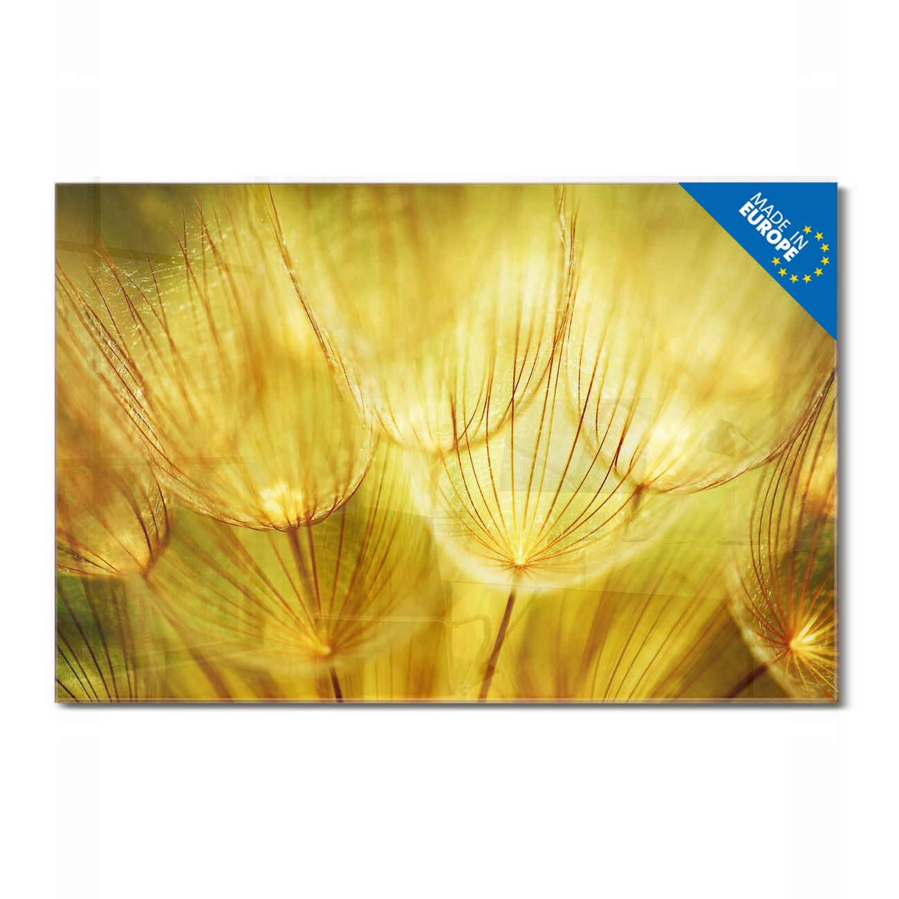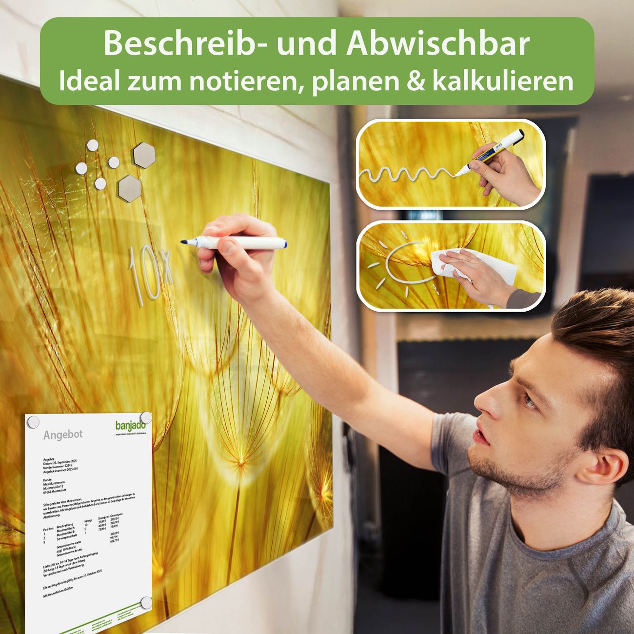 Material: 4mm Sicherheitsglas mit Metallrückwand Eigenschaften: beschreibbar, magnetisch, kratzfest Maße: 120x80x0,6cm, 14,40kg schwer Motiv Nummer 12265 Pusteblumen Gold Zubehör: inklusive 4 Neodym-Magnete
