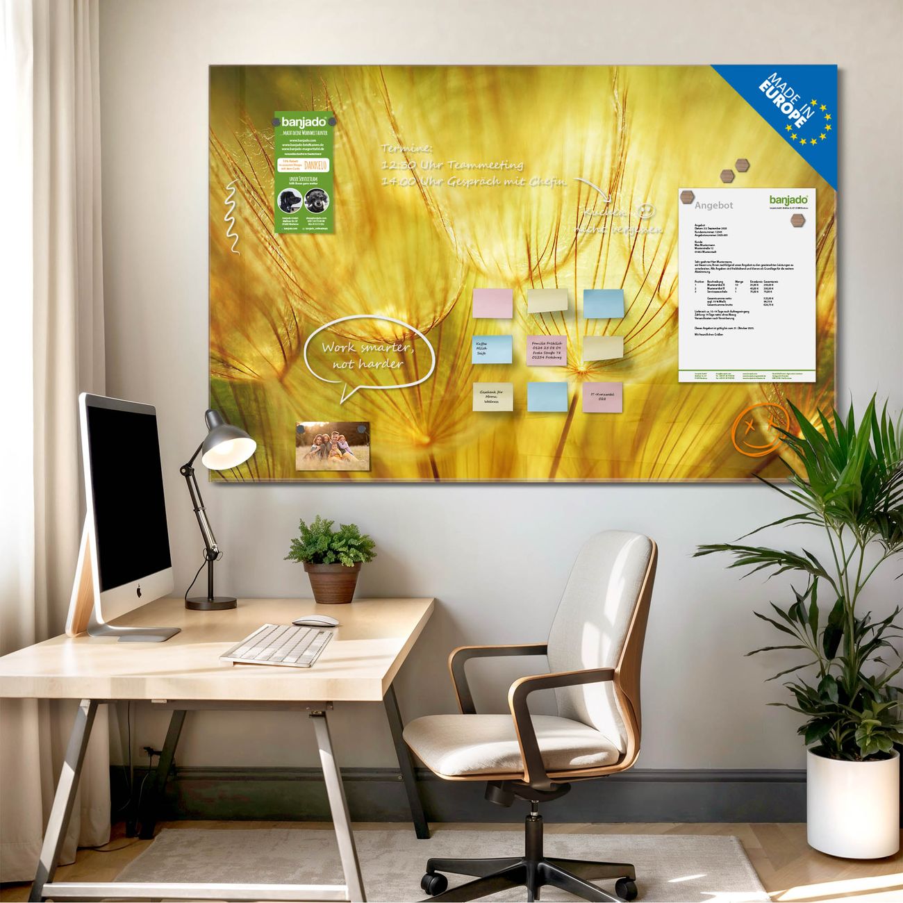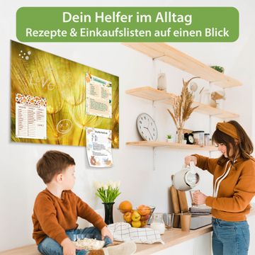 Die banjado Glas Magnettafel mit dem Motiv Motiv Pusteblumen Gold verbindet Funktionalität mit Stil. Sie ersetzt das Zettelchaos durch klare Strukturen und bringt dabei eine warme, natürliche Atmosphäre in Ihr Zuhause. Ob im Büro, in der Küche oder im Eingangsbereich - dieses Design-Board zieht Blicke an und sorgt für Ordnung mit Charakter.