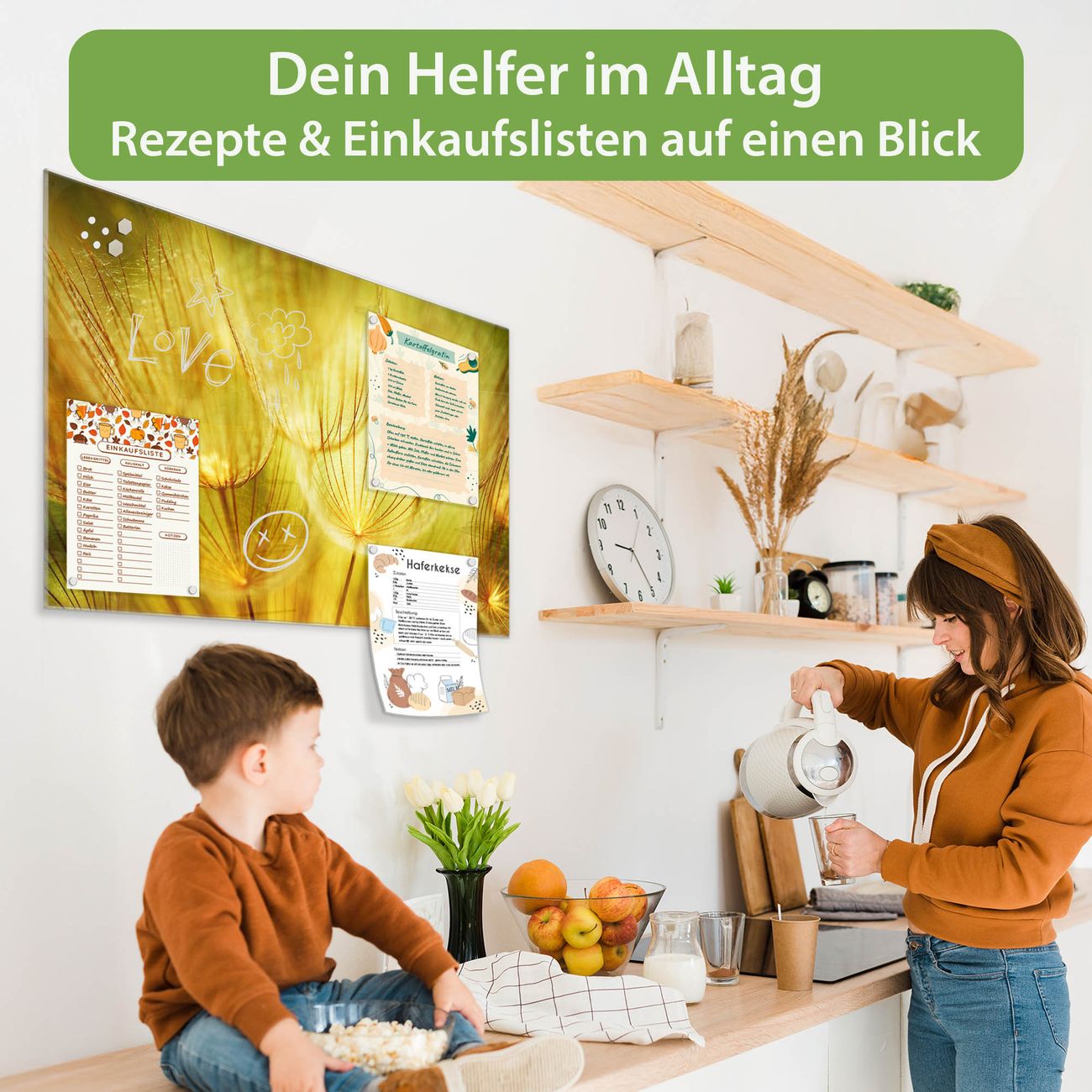 Ein Stück Design, das Ihren Alltag organisiert. Schreiben, heften, inspirieren - alles an einem Ort. Qualität, die man spürt. Montage leicht gemacht. Handwerk mit Herz - veredelt in Sachsen. Einzigartiges Design mit Motiv Motiv Pusteblumen Gold Beschreibbare Glasoberfläche, leicht zu reinigen Starke Magnetkraft durch Stahlrückwand Inklusive 4 Neodym-Magneten Flexible Montageoptionen Handveredelt in Sachsen - Qualität, die bleibt