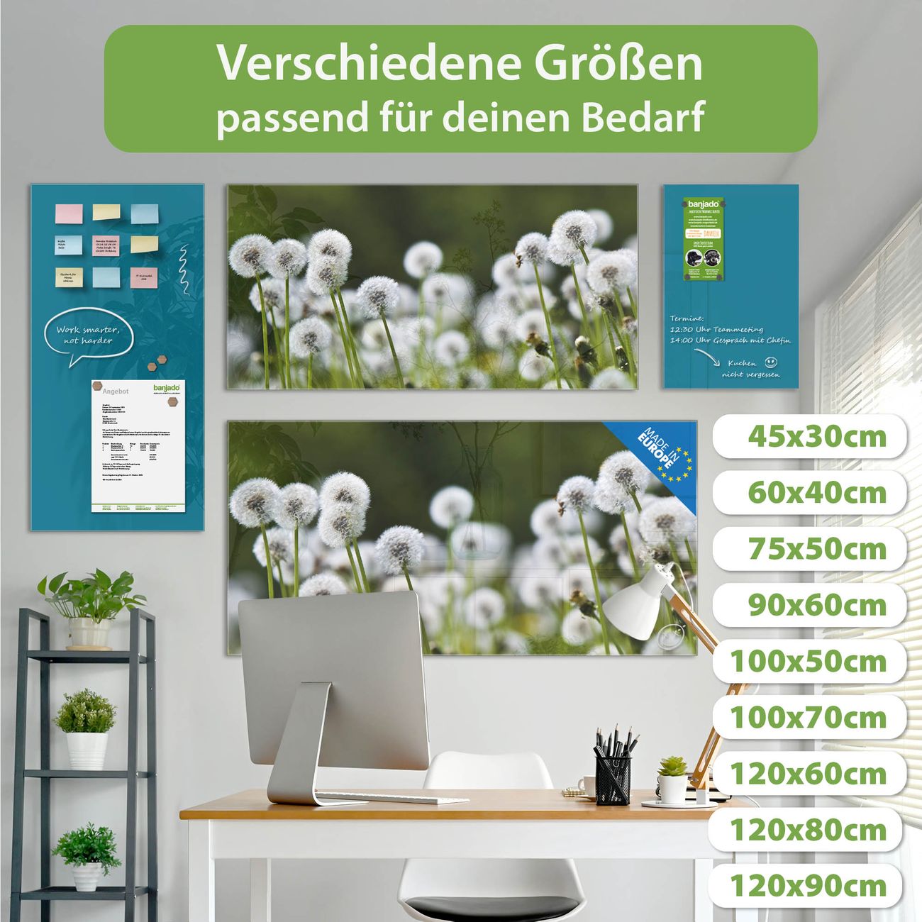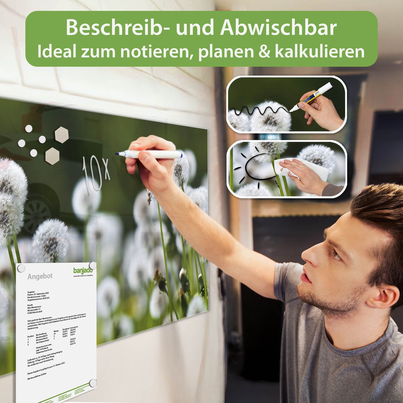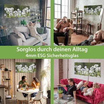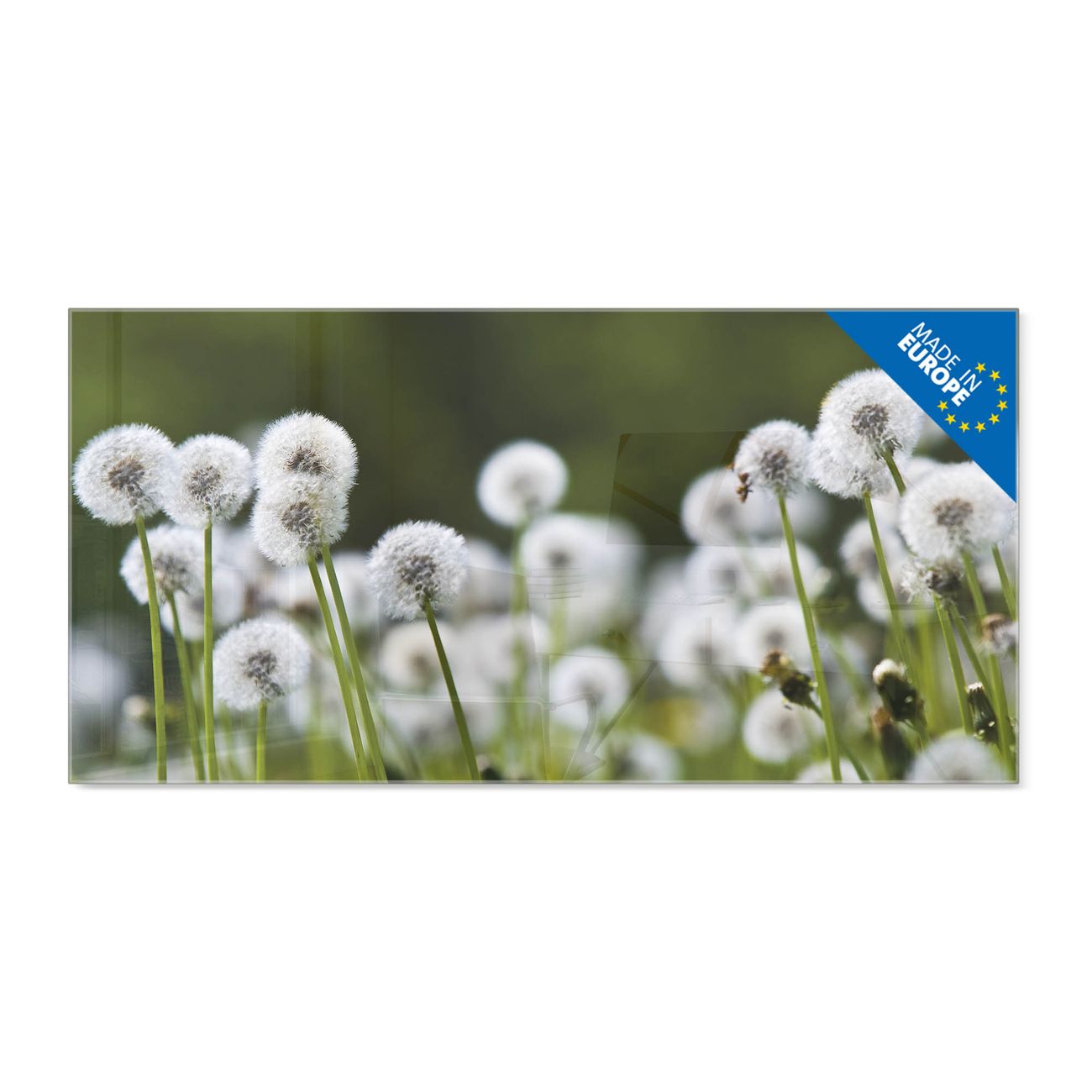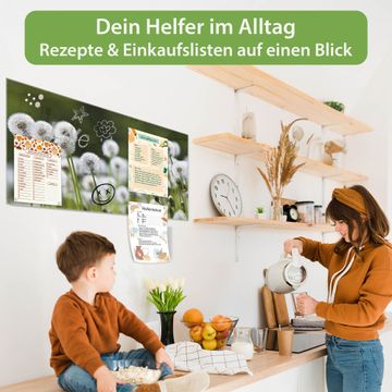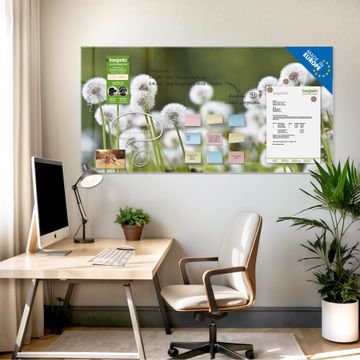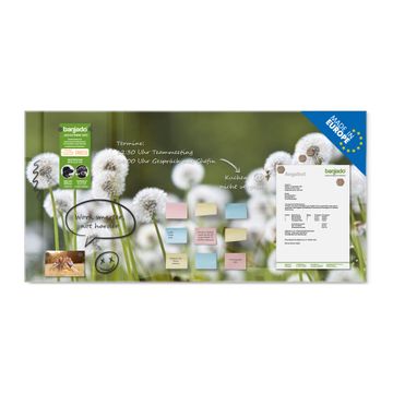 Material: 4mm Sicherheitsglas mit Metallrückwand Eigenschaften: beschreibbar, magnetisch, kratzfest Maße: 100x50x0,6cm, 7,50kg schwer Motiv Nummer 12277 Pusteblumenwiese Zubehör: inklusive 4 Neodym-Magnete