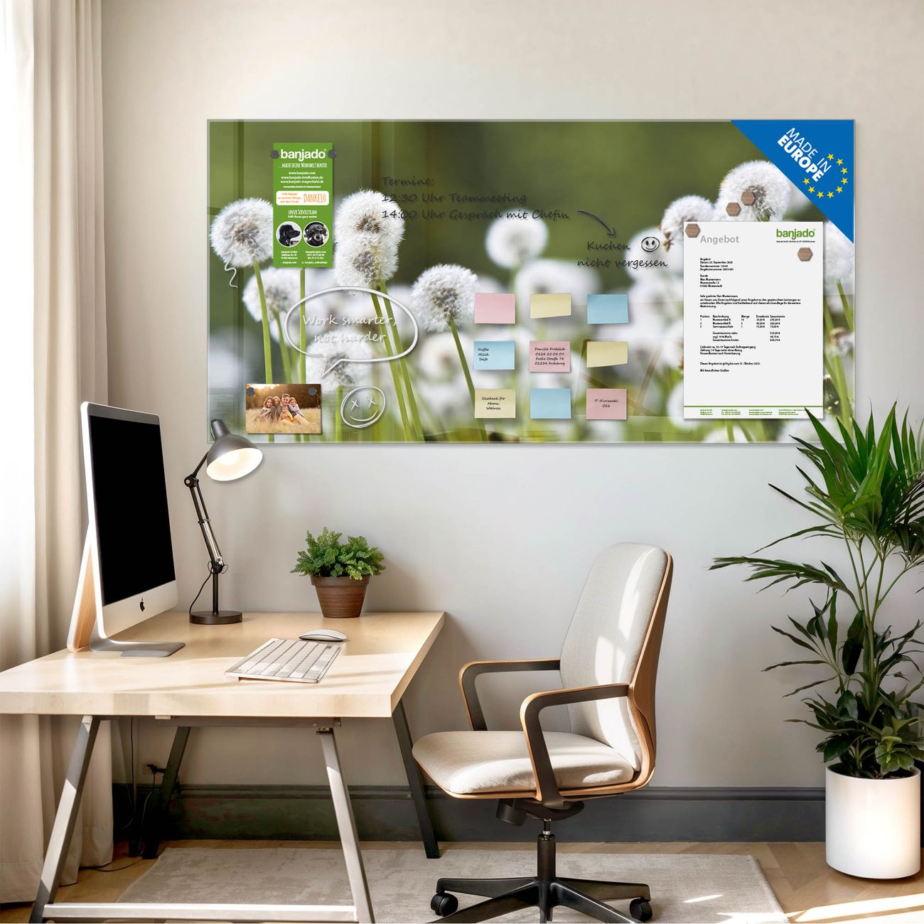 Jede Glas Magnettafel wird in unserer Werkstatt von Hand gefertigt und sorgfältig geprüft. So erhalten Sie ein echtes Qualitätsprodukt, das Funktion und Ästhetik perfekt vereint.?? Warum banjado?