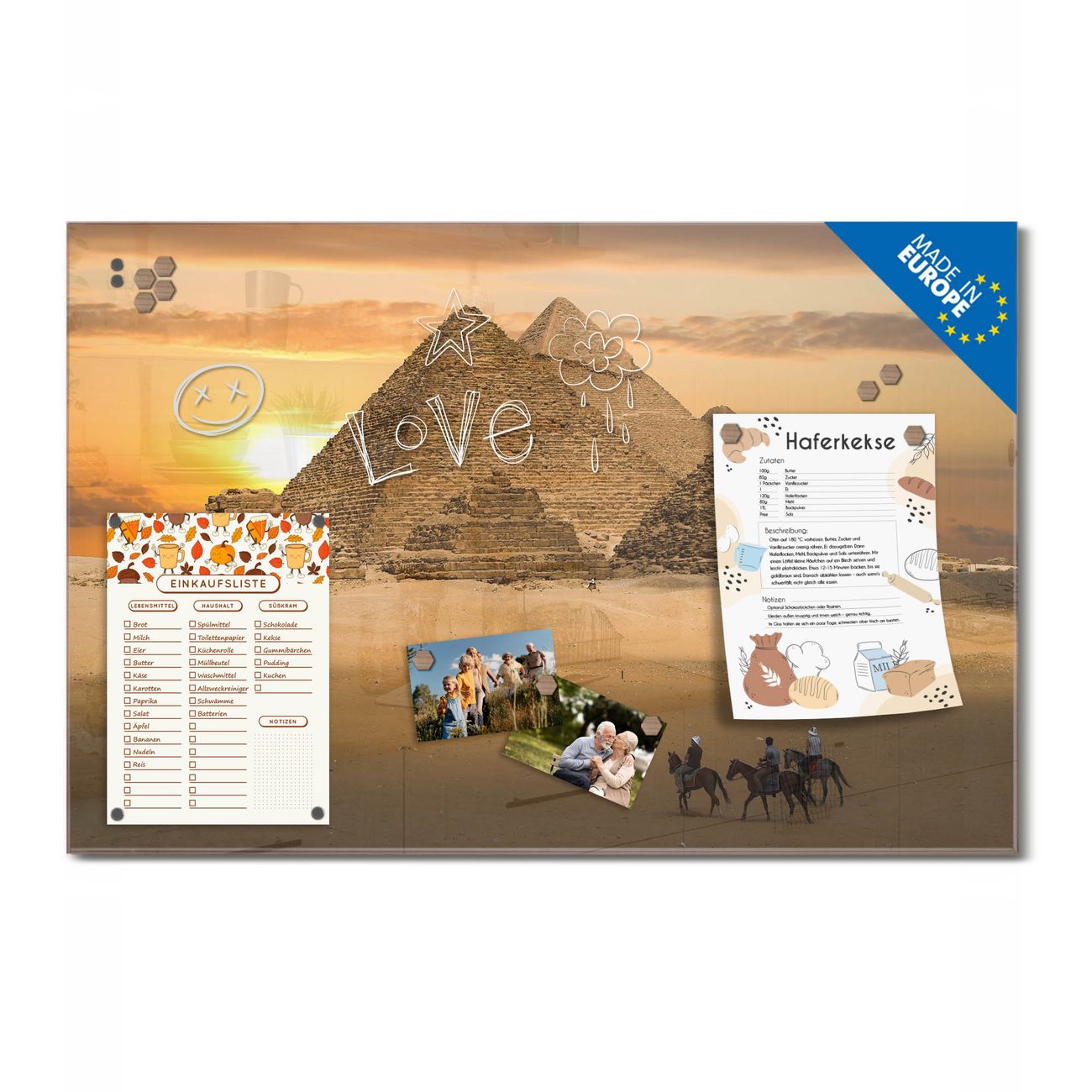 Ein Stück Design, das Ihren Alltag organisiert. Schreiben, heften, inspirieren - alles an einem Ort. Qualität, die man spürt. Montage leicht gemacht. Handwerk mit Herz - veredelt in Sachsen. Einzigartiges Design mit Motiv Motiv Pyramiden Beschreibbare Glasoberfläche, leicht zu reinigen Starke Magnetkraft durch Stahlrückwand Inklusive 4 Neodym-Magneten Flexible Montageoptionen Handveredelt in Sachsen - Qualität, die bleibt