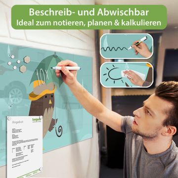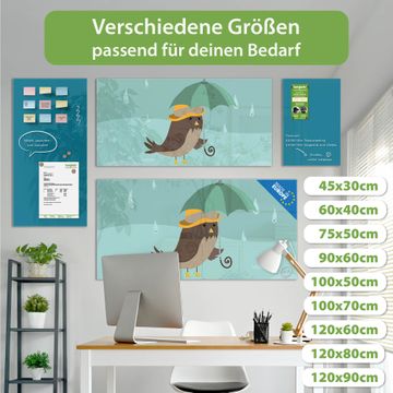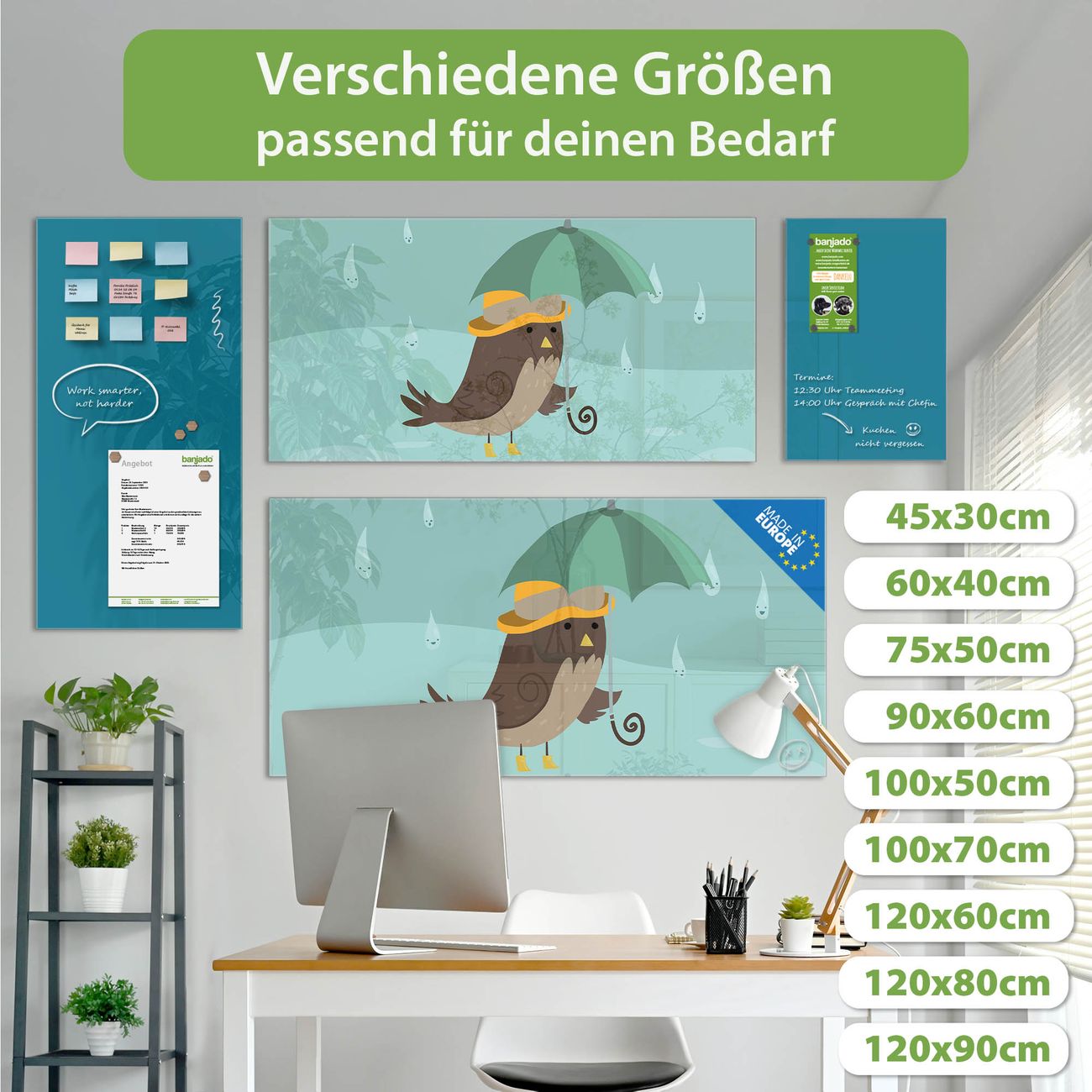 Material: 4mm Sicherheitsglas mit Metallrückwand Eigenschaften: beschreibbar, magnetisch, kratzfest Maße: 100x50x0,6cm, 7,50kg schwer Motiv Nummer 12232 Rainbird Zubehör: inklusive 4 Neodym-Magnete