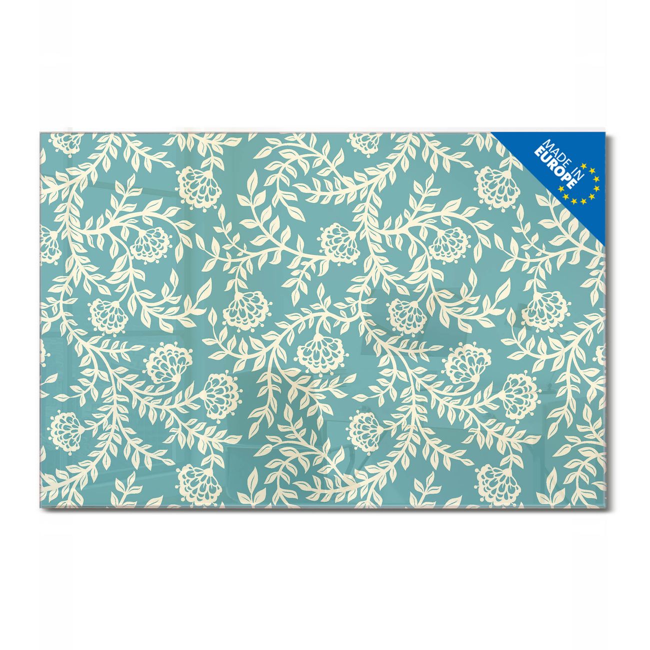 Material: 4mm Sicherheitsglas mit Metallrückwand Eigenschaften: beschreibbar, magnetisch, kratzfest Maße: 120x80x0,6cm, 14,40kg schwer Motiv Nummer 12154 Rankenornament Zubehör: inklusive 4 Neodym-Magnete