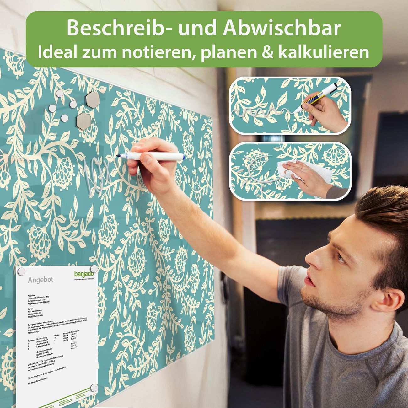 Jede Glas Magnettafel wird in unserer Werkstatt von Hand gefertigt und sorgfältig geprüft. So erhalten Sie ein echtes Qualitätsprodukt, das Funktion und Ästhetik perfekt vereint.?? Warum banjado?