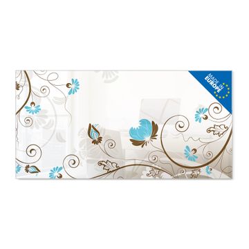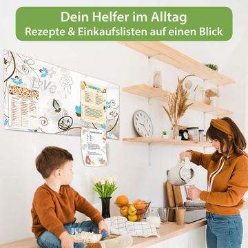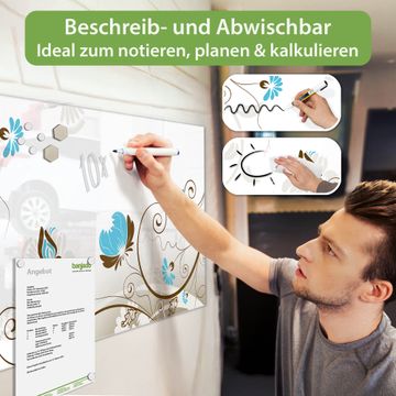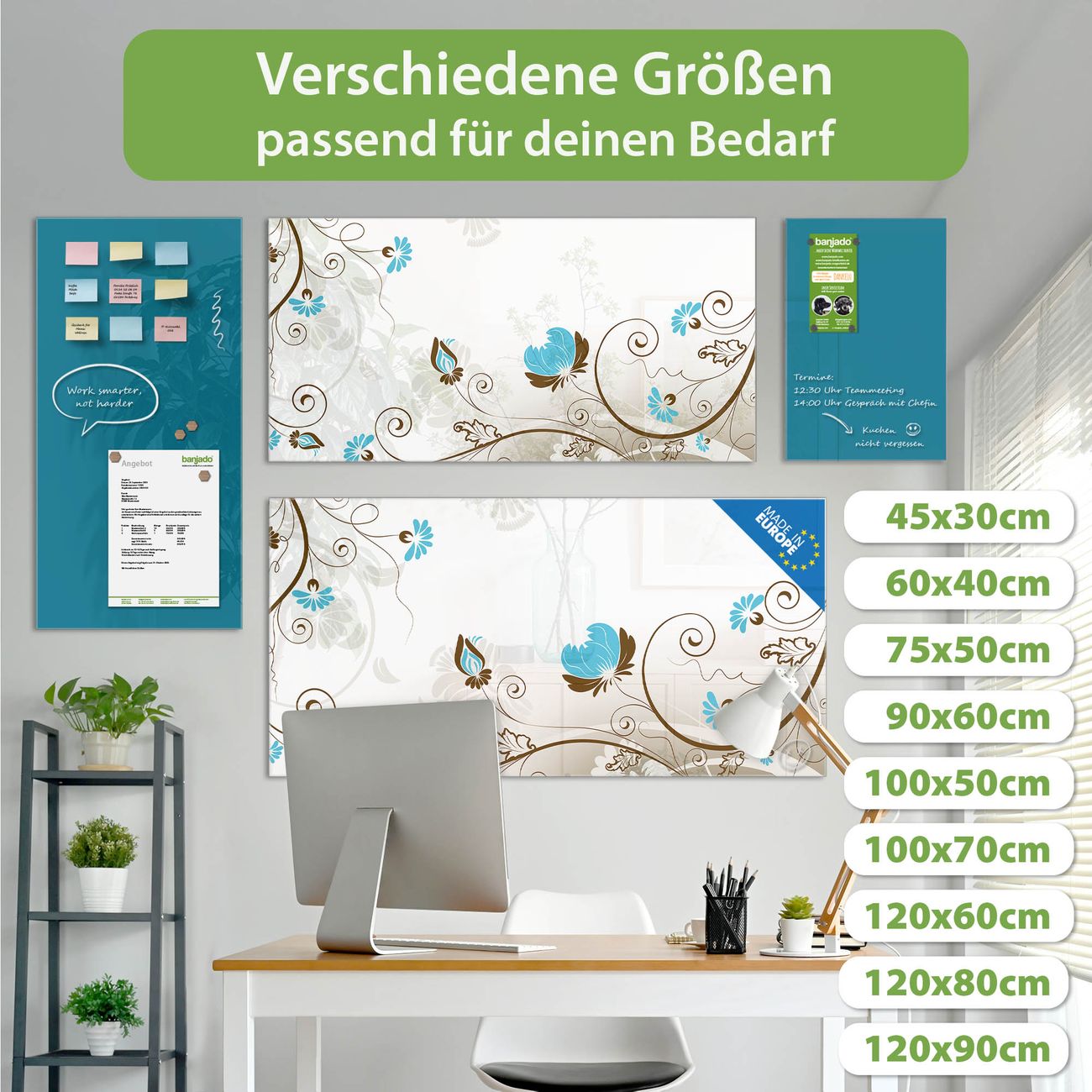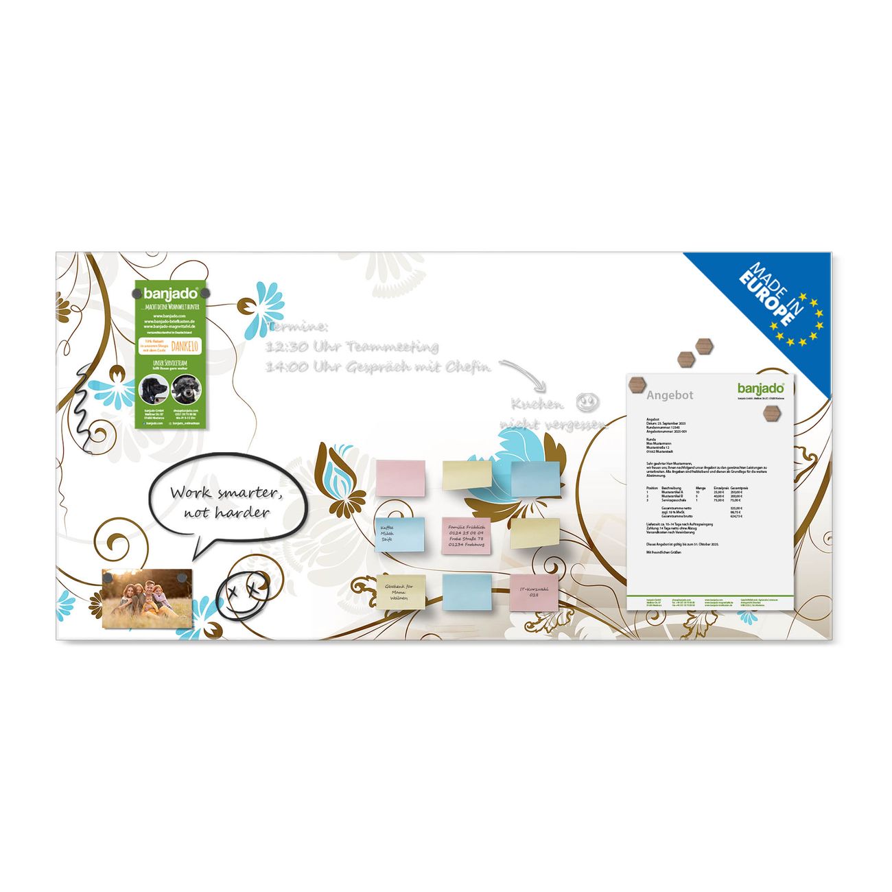 Material: 4mm Sicherheitsglas mit Metallrückwand Eigenschaften: beschreibbar, magnetisch, kratzfest Maße: 100x50x0,6cm, 7,50kg schwer Motiv Nummer 11339 Rankenrahmen Zubehör: inklusive 4 Neodym-Magnete