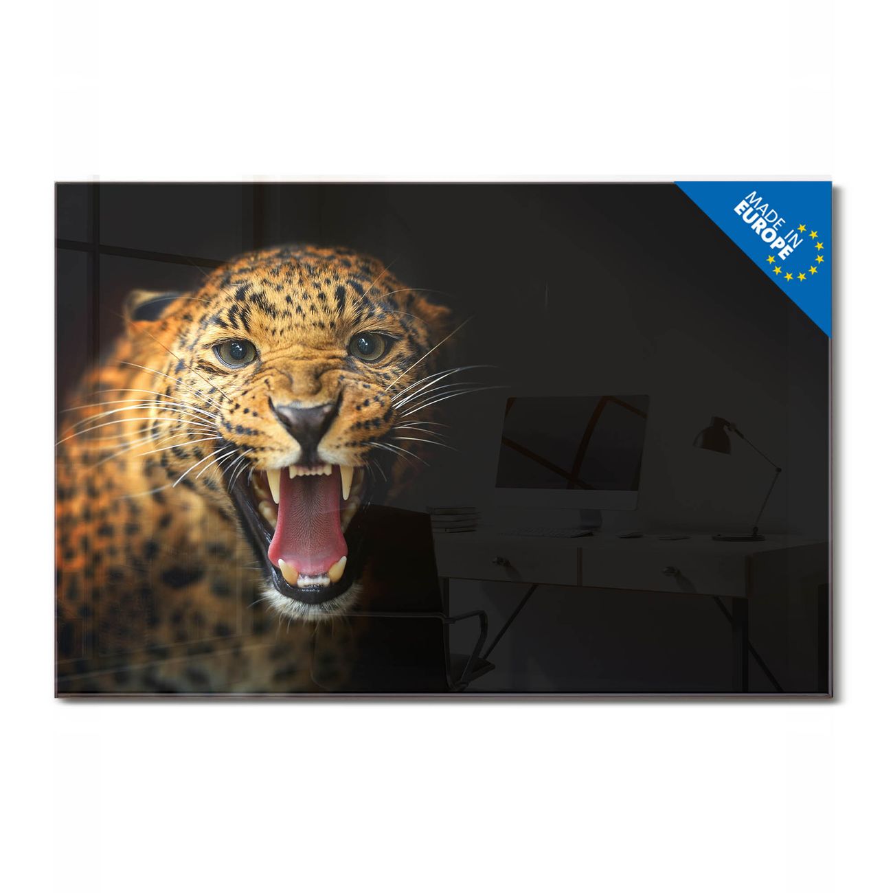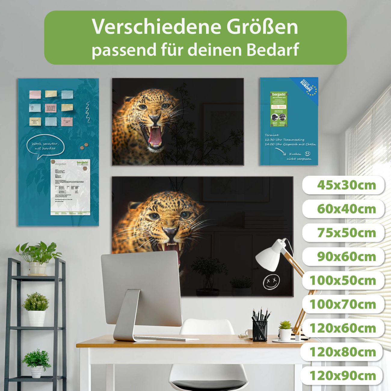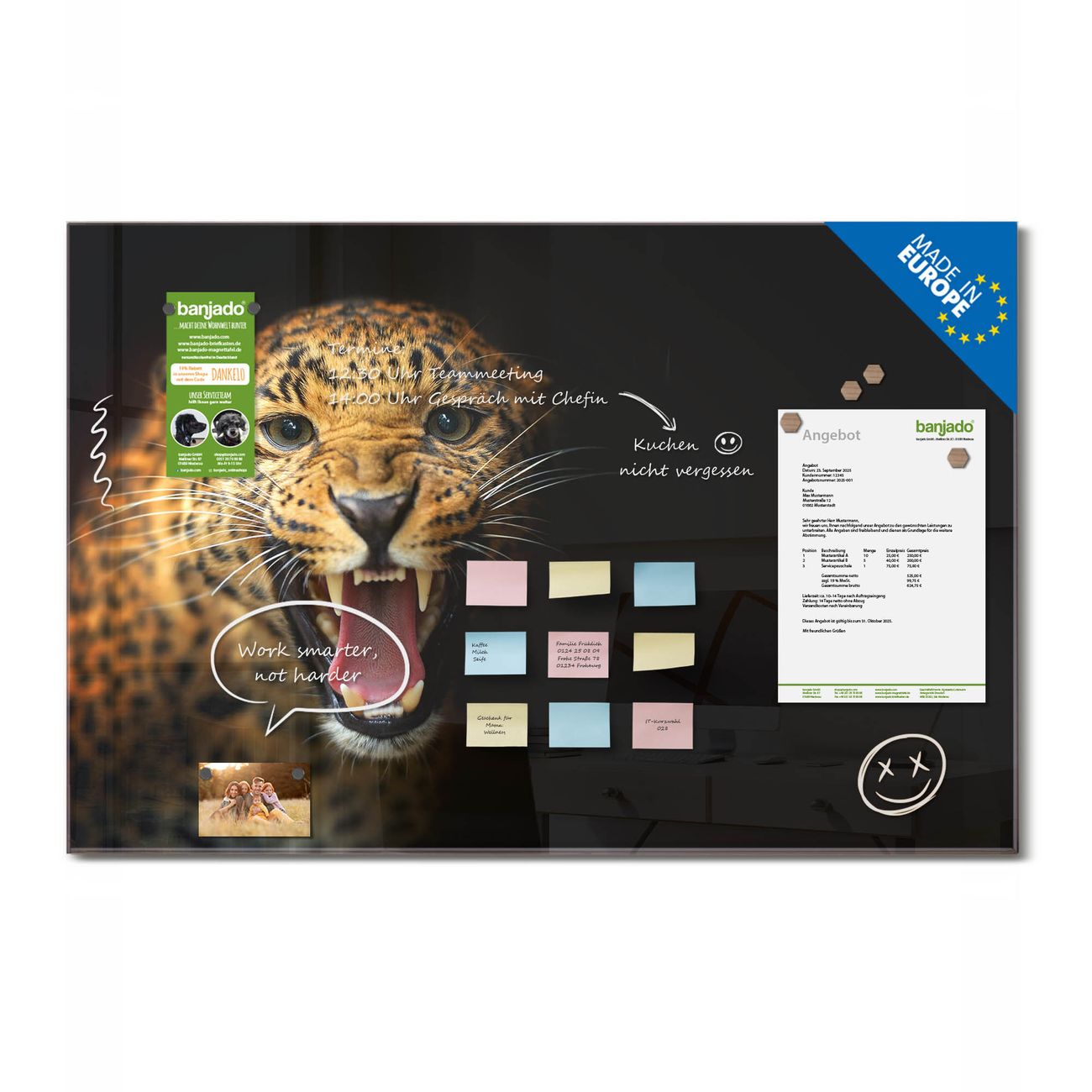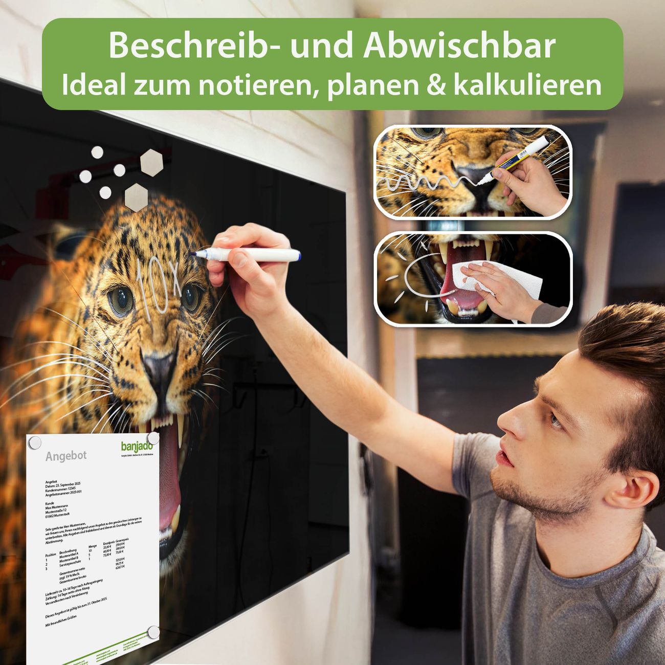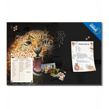 Material: 4mm Sicherheitsglas mit Metallrückwand Eigenschaften: beschreibbar, magnetisch, kratzfest Maße: 120x80x0,6cm, 14,40kg schwer Motiv Nummer 10499 Raubkatze Zubehör: inklusive 4 Neodym-Magnete
