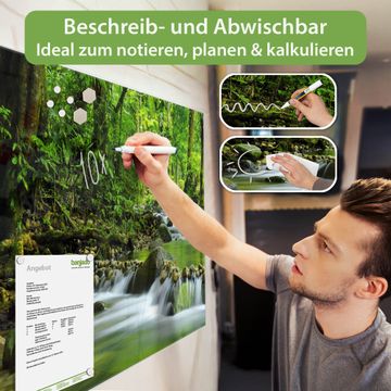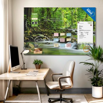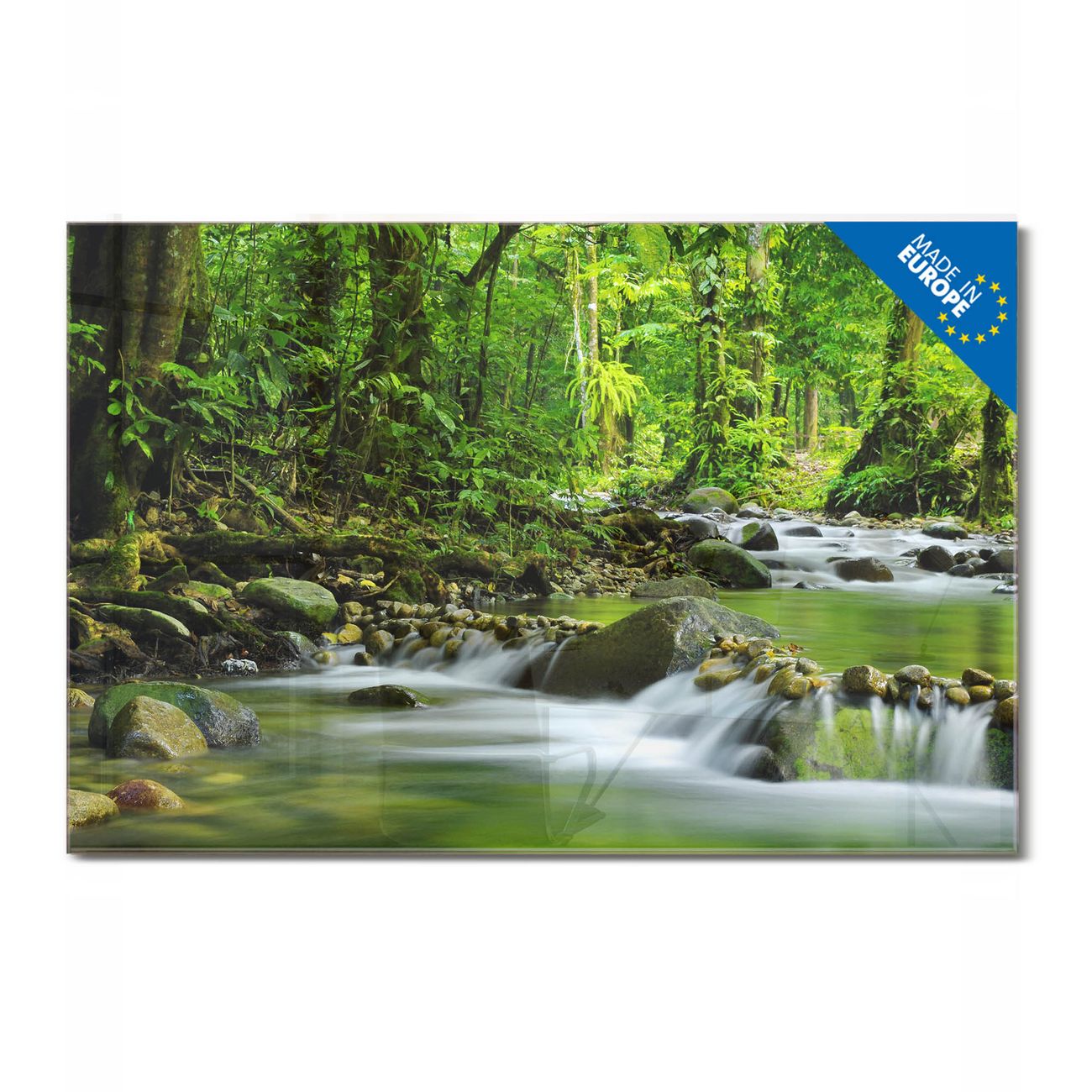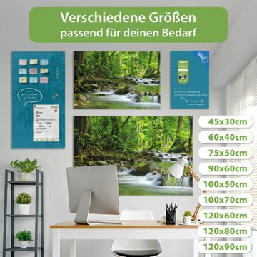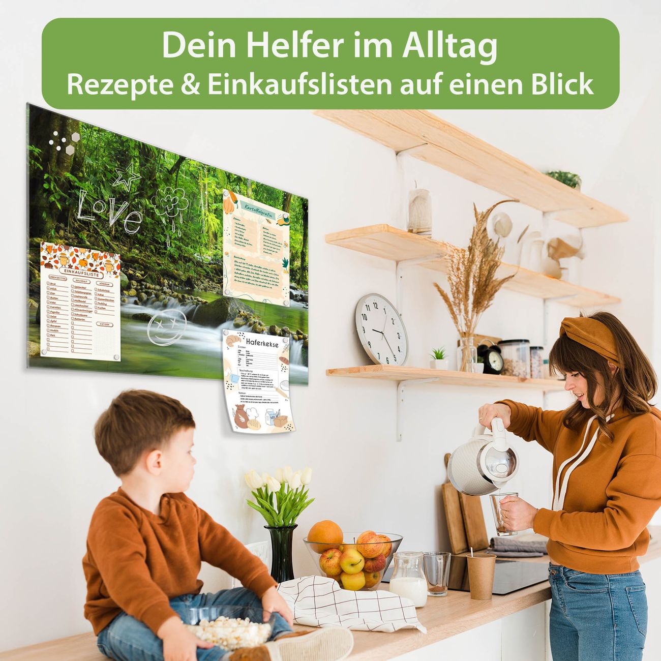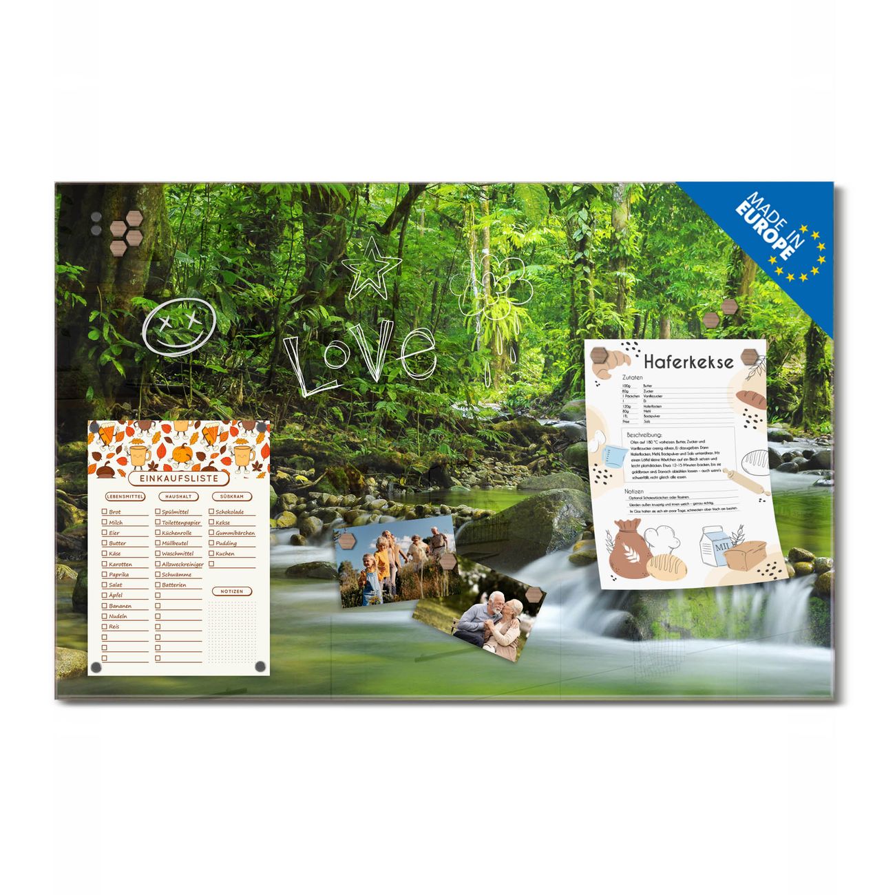 Material: 4mm Sicherheitsglas mit Metallrückwand Eigenschaften: beschreibbar, magnetisch, kratzfest Maße: 75x50x0,6cm, 5,63kg schwer Motiv Nummer 10114 Rauschender Bach Zubehör: inklusive 4 Neodym-Magnete