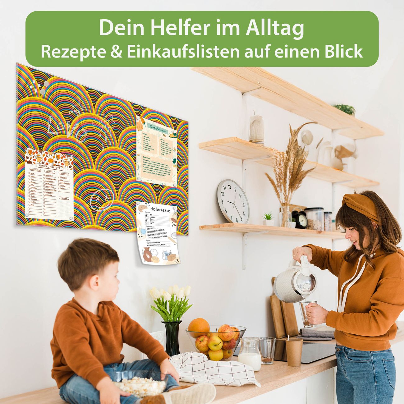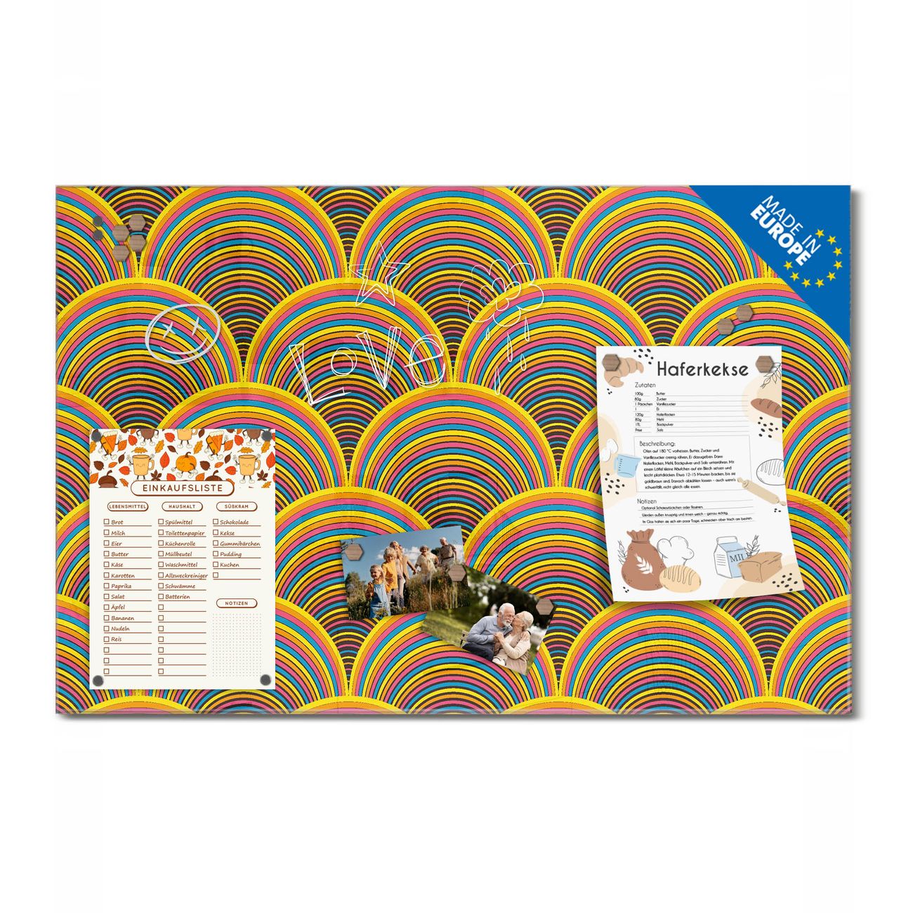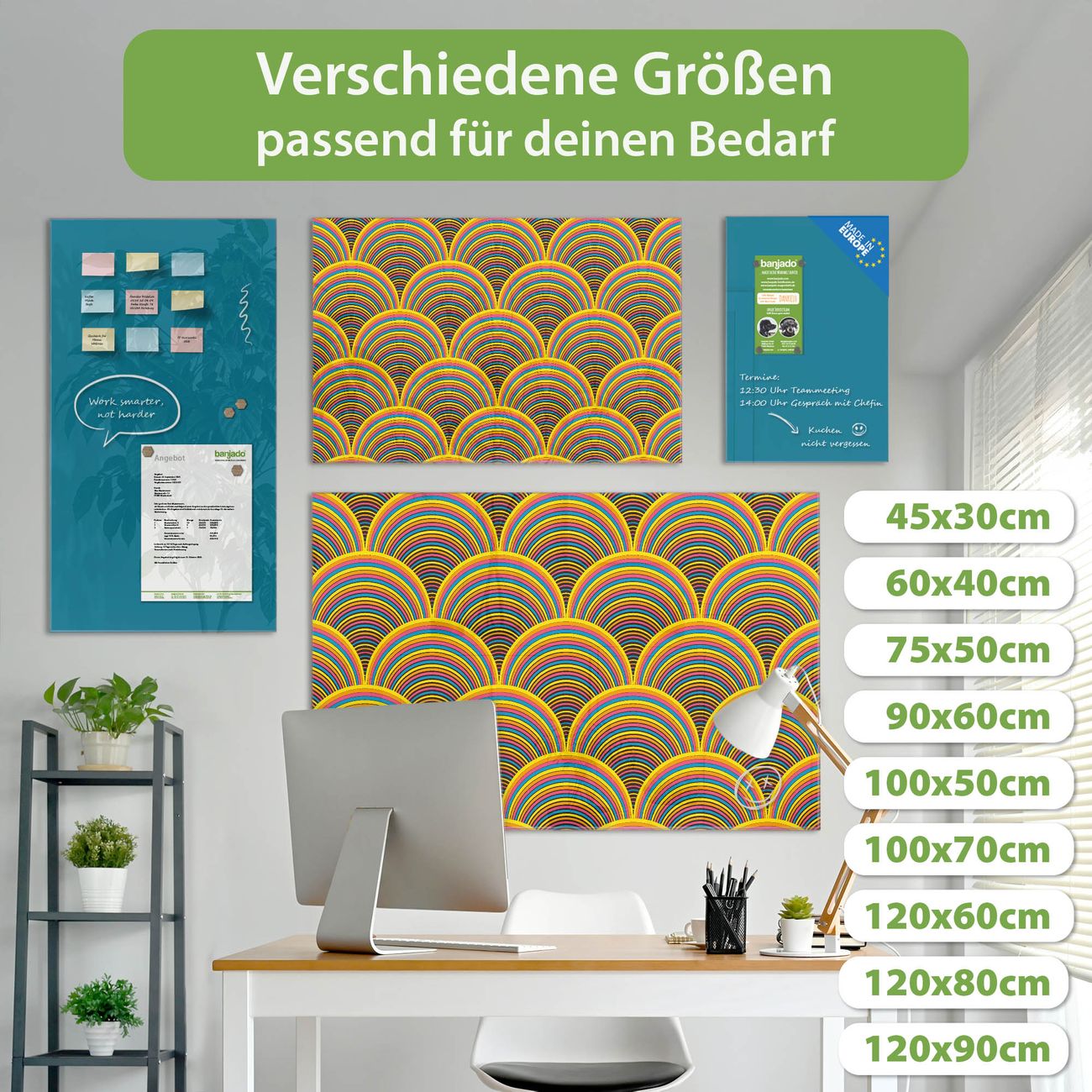 Material: 4mm Sicherheitsglas mit Metallrückwand Eigenschaften: beschreibbar, magnetisch, kratzfest Maße: 100x50x0,6cm, 7,50kg schwer Motiv Nummer 12018 Regenbögen Zubehör: inklusive 4 Neodym-Magnete