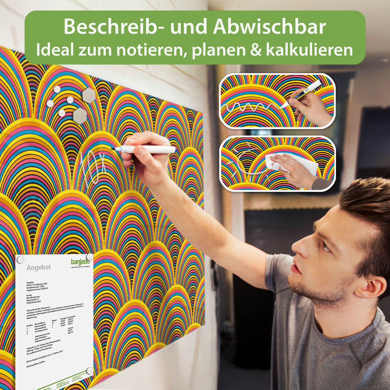 Das Magnetboard besteht aus gehärtetem Glas, die Rückwand aus einem magnetischen Stahlblech. Durch die superflache Bauweise haben Sie die Wahl aus einer Vielzahl von Befestigungsmöglichkeiten. Sie können die Magnettafel mit einem Montagekleber superflach an die Wand kleben oder Sie wählen eines unserer passenden Befestigungssets, welches eine optimale Montage garantiert. Die Magnetwand besteht aus zertifiziertem Sicherheitsglas. Durch die mitgelieferten 4 Neodym-Magnete ist Ihre Glas Magnettafel sofort einsatzbereit. Wichtige Notizen und Informationen können Sie einfach mit Kreidestiften auf die Glasmagnettafel schreiben und rückstandslos wieder entfernen.