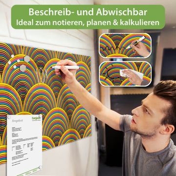Material: 4mm Sicherheitsglas mit Metallrückwand Eigenschaften: beschreibbar, magnetisch, kratzfest Maße: 120x60x0,6cm, 10,80kg schwer Motiv Nummer 12018 Regenbögen Zubehör: inklusive 4 Neodym-Magnete