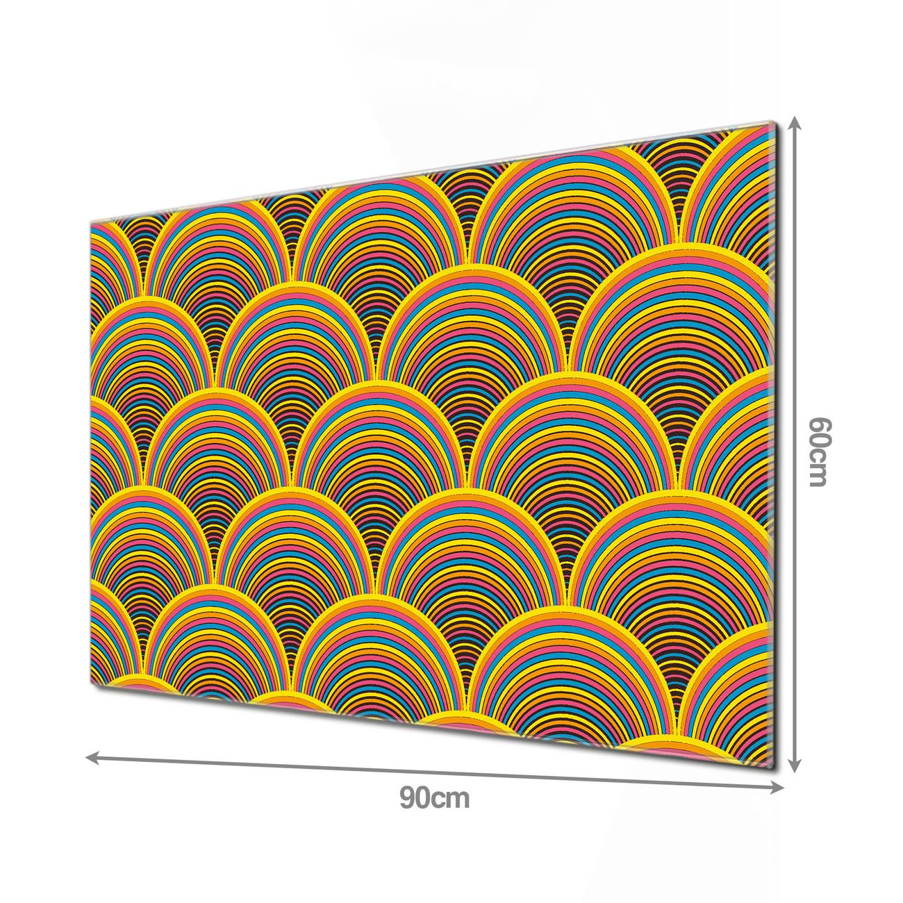 Material: 4mm Sicherheitsglas mit Metallrückwand Eigenschaften: beschreibbar, magnetisch, kratzfest Maße: 90x60x0,6cm, 8,10kg schwer Motiv Nummer 12018 Regenbögen Zubehör: inklusive 4 Neodym-Magnete