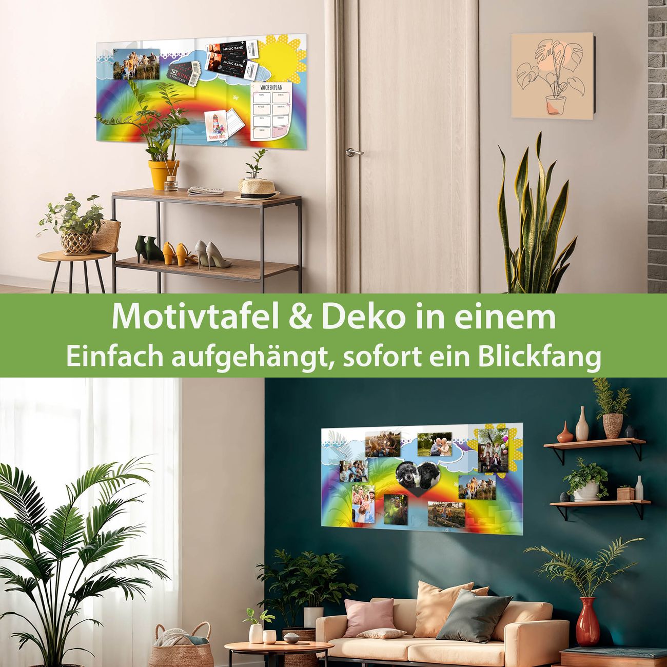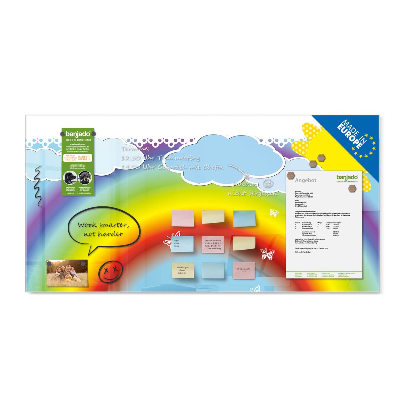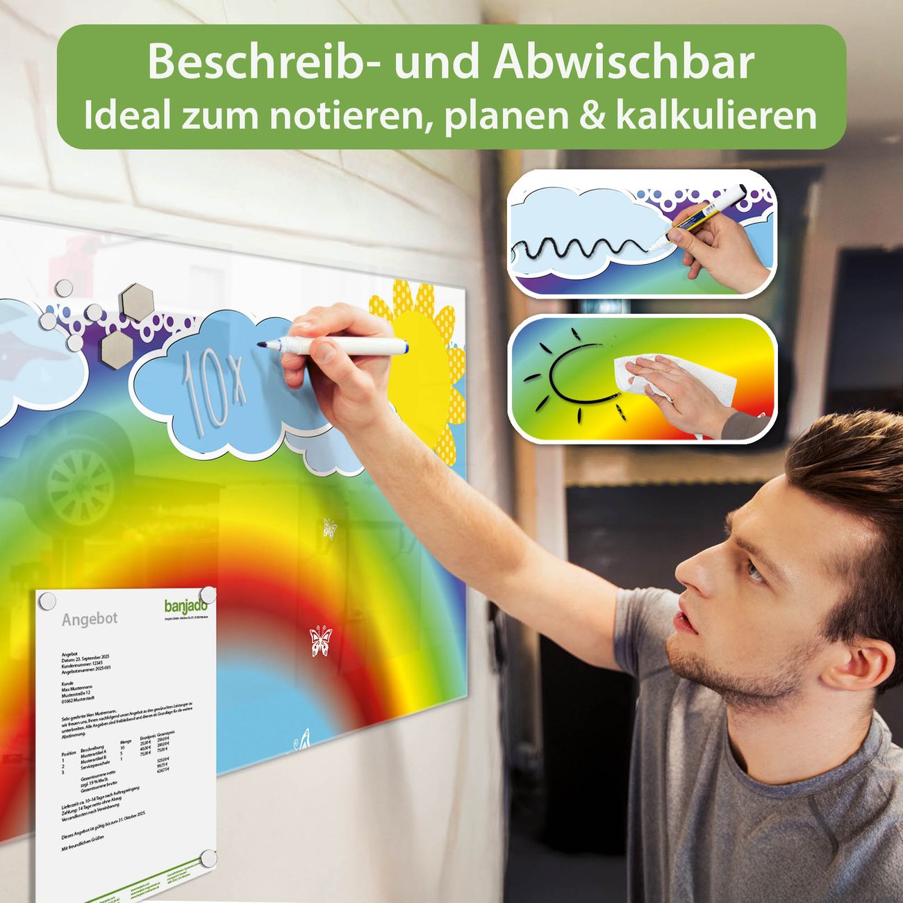 Material: 4mm Sicherheitsglas mit Metallrückwand Eigenschaften: beschreibbar, magnetisch, kratzfest Maße: 100x50x0,6cm, 7,50kg schwer Motiv Nummer 10232 Regenbogen Zubehör: inklusive 4 Neodym-Magnete