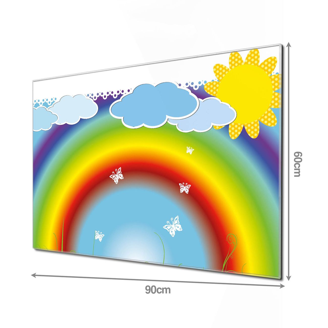 Material: 4mm Sicherheitsglas mit Metallrückwand Eigenschaften: beschreibbar, magnetisch, kratzfest Maße: 90x60x0,6cm, 8,10kg schwer Motiv Nummer 10232 Regenbogen Zubehör: inklusive 4 Neodym-Magnete