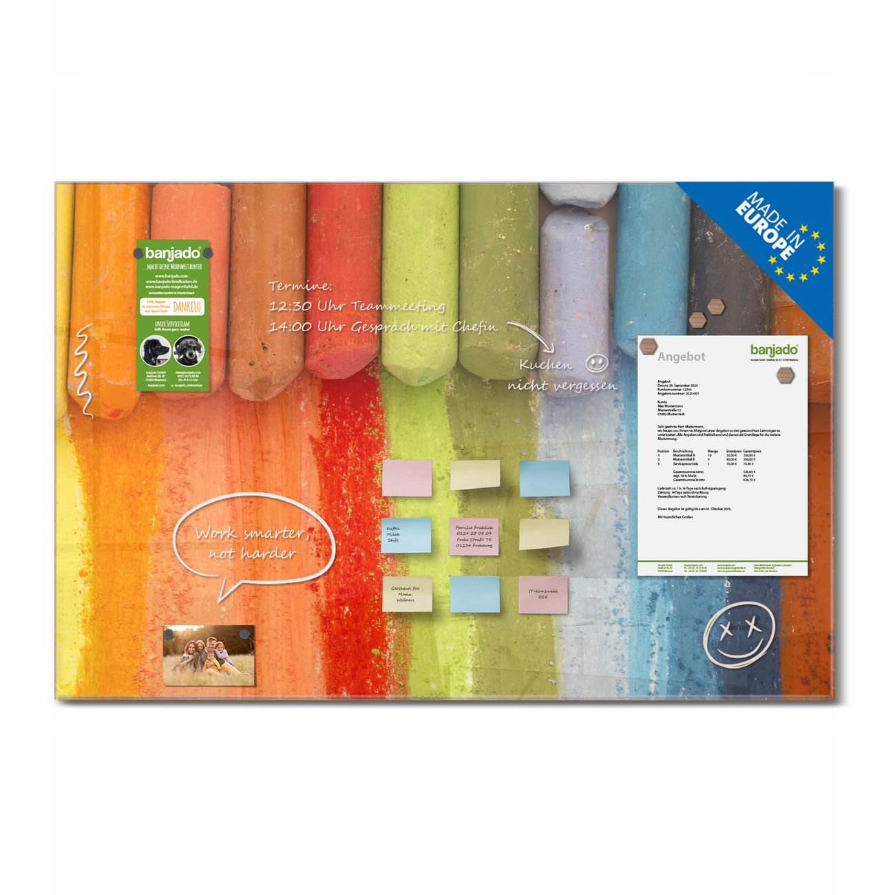 Die banjado Glas Magnettafel mit dem Motiv Motiv Regenbogenkreide verbindet Funktionalität mit Stil. Sie ersetzt das Zettelchaos durch klare Strukturen und bringt dabei eine warme, natürliche Atmosphäre in Ihr Zuhause. Ob im Büro, in der Küche oder im Eingangsbereich - dieses Design-Board zieht Blicke an und sorgt für Ordnung mit Charakter.