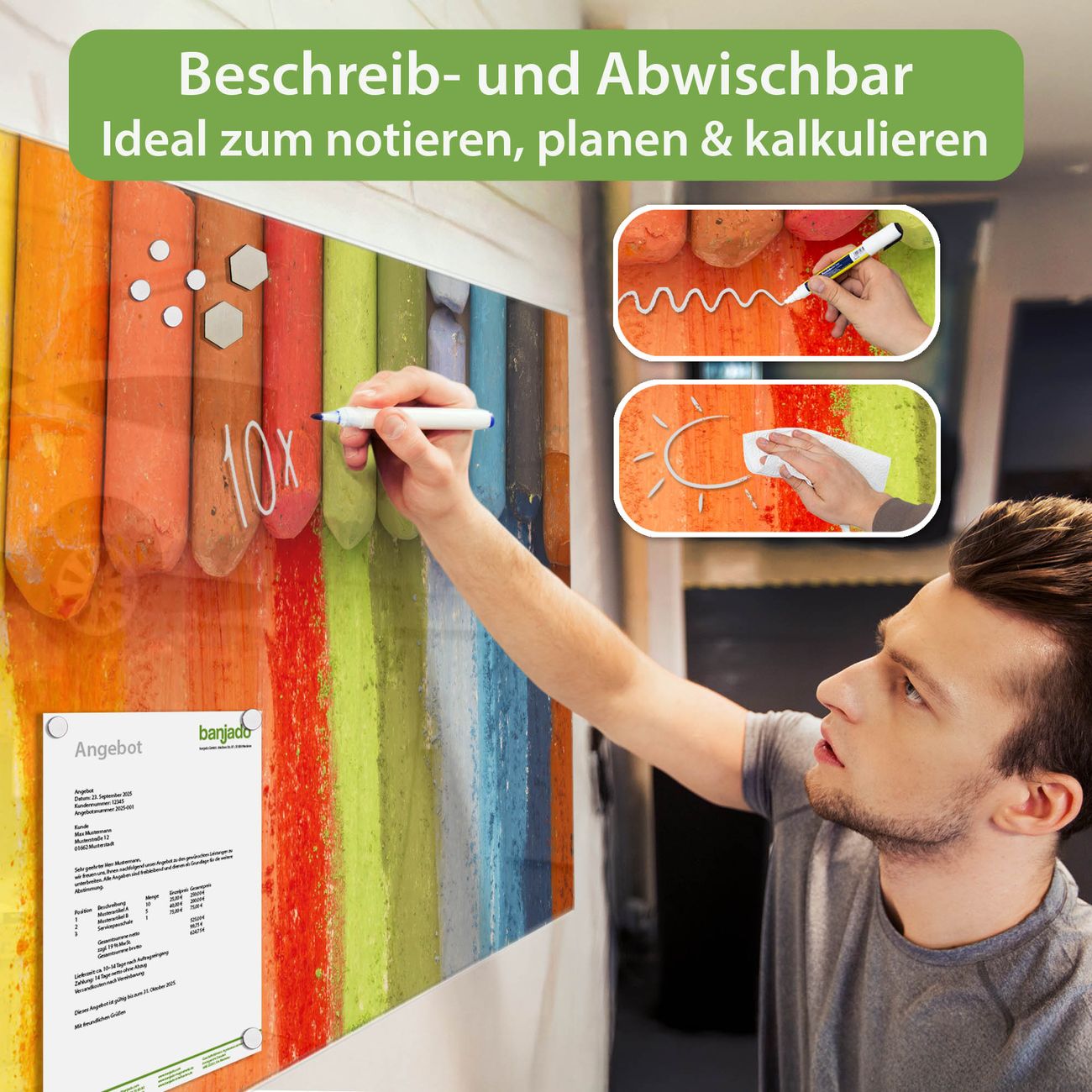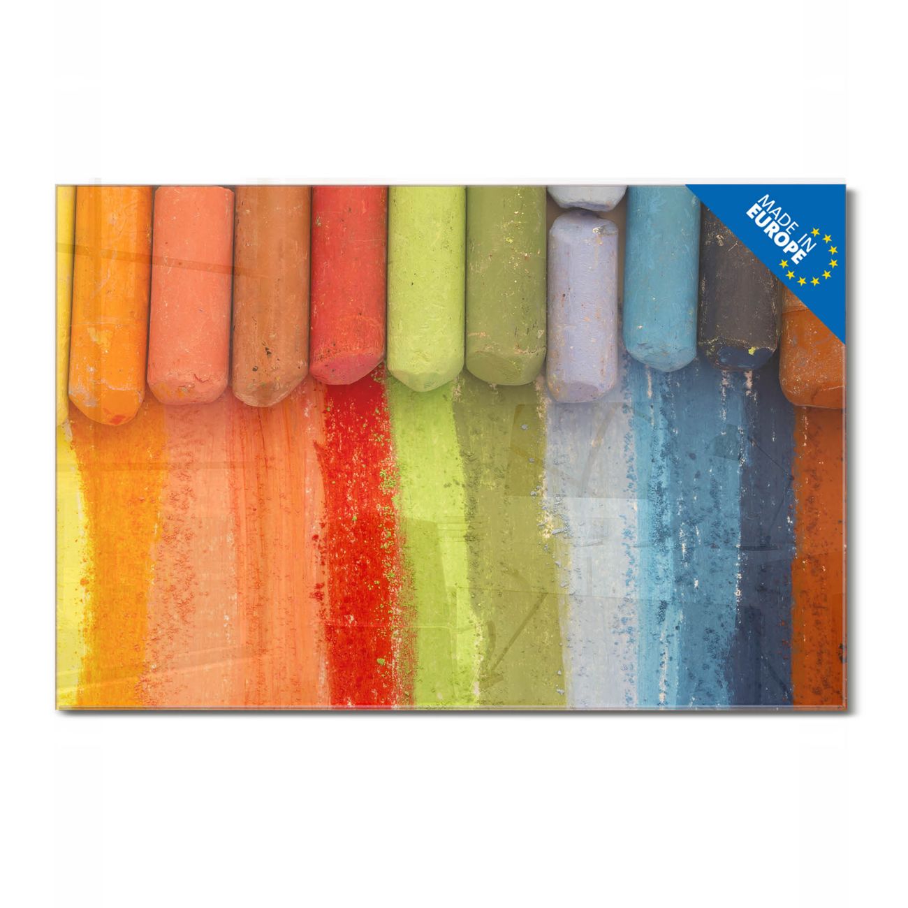 Material: 4mm Sicherheitsglas mit Metallrückwand Eigenschaften: beschreibbar, magnetisch, kratzfest Maße: 75x50x0,6cm, 5,63kg schwer Motiv Nummer 10626 Regenbogenkreide Zubehör: inklusive 4 Neodym-Magnete