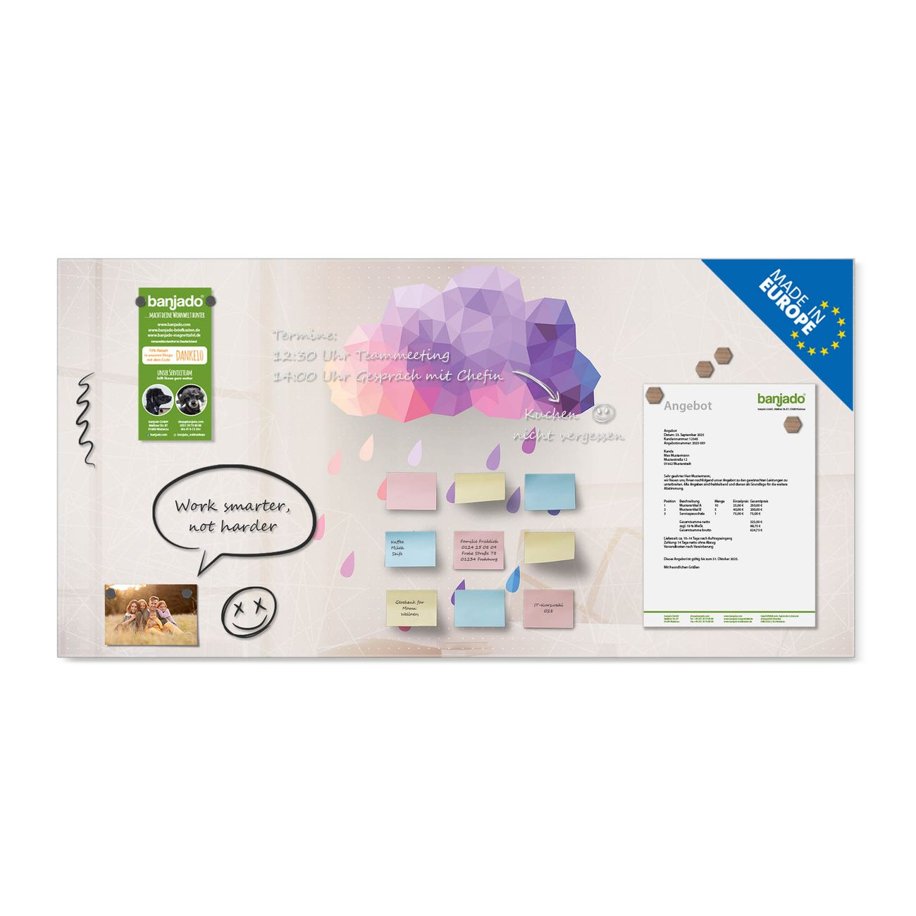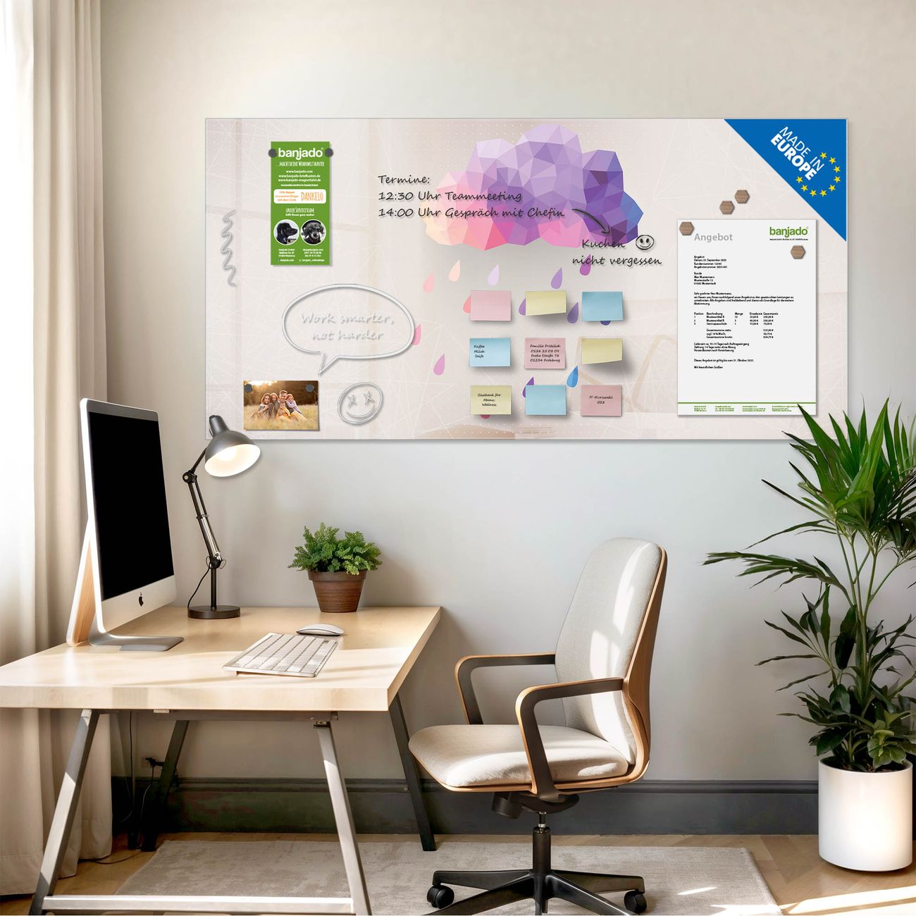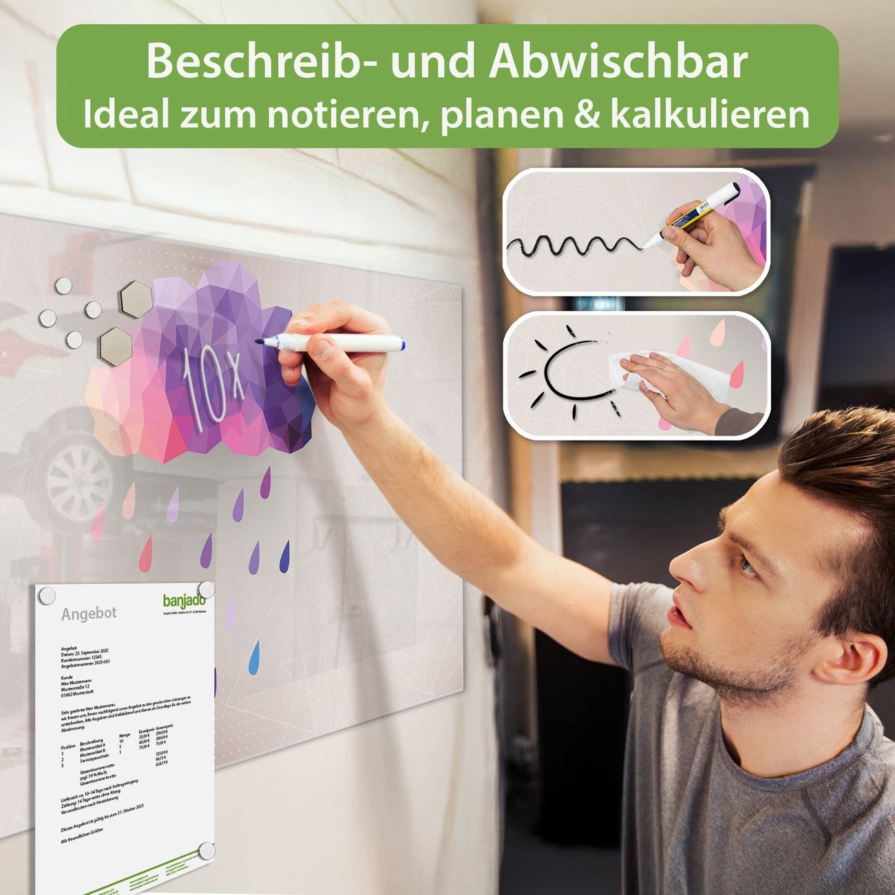 Jede Glas Magnettafel wird in unserer Werkstatt von Hand gefertigt und sorgfältig geprüft. So erhalten Sie ein echtes Qualitätsprodukt, das Funktion und Ästhetik perfekt vereint.?? Warum banjado?