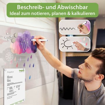 Auf der glatten Glasoberfläche lassen sich Termine, Rezepte oder Notizen ganz einfach mit Kreidestiften festhalten und rückstandslos entfernen. Starke Neodym-Magnete halten Ihre wichtigsten Erinnerungen sicher an Ort und Stelle. So entsteht Ihre ganz persönliche Ideenwand - jeden Tag neu.