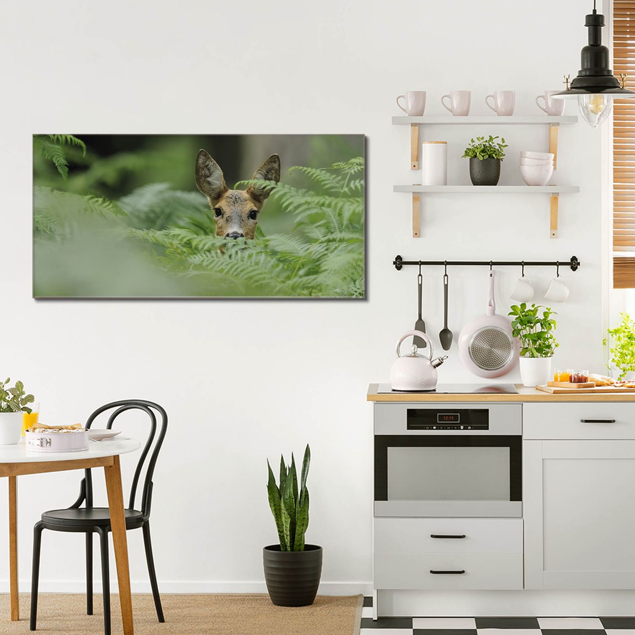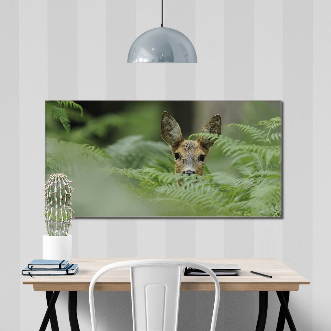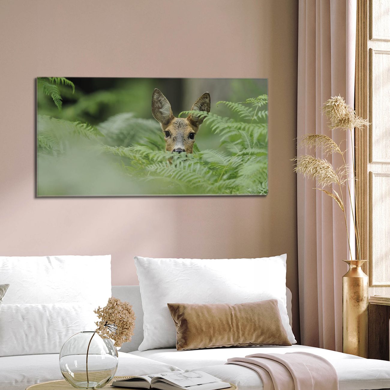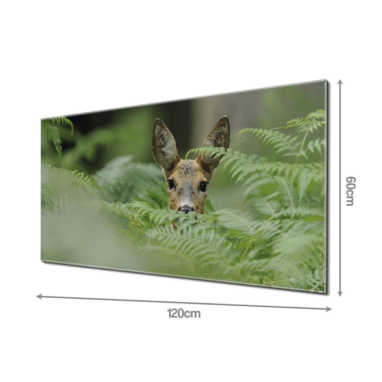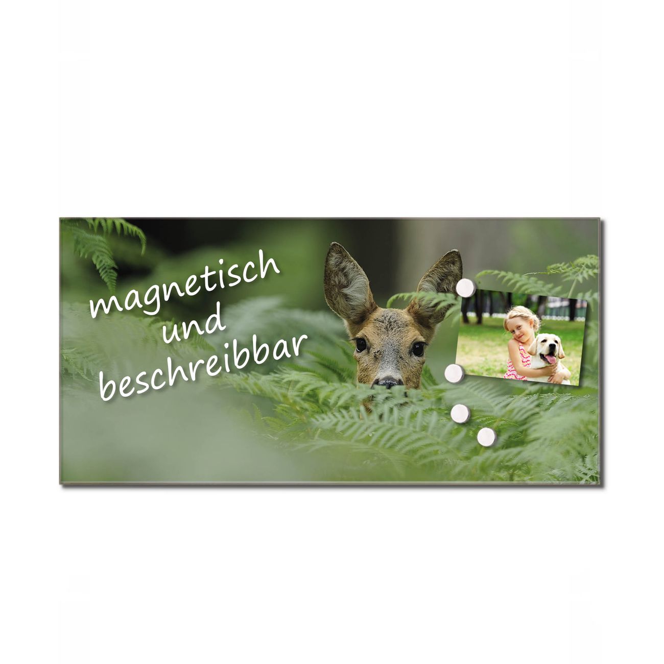 Material: 4mm Sicherheitsglas mit Metallrückwand Eigenschaften: beschreibbar, magnetisch, kratzfest Maße: 120x60x0,6cm, 10,80kg schwer Motiv Nummer 10497 Reh Zubehör: inklusive 4 Neodym-Magnete