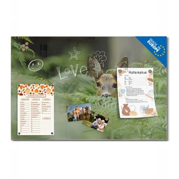 Material: 4mm Sicherheitsglas mit Metallrückwand Eigenschaften: beschreibbar, magnetisch, kratzfest Maße: 75x50x0,6cm, 5,63kg schwer Motiv Nummer 10497 Reh Zubehör: inklusive 4 Neodym-Magnete