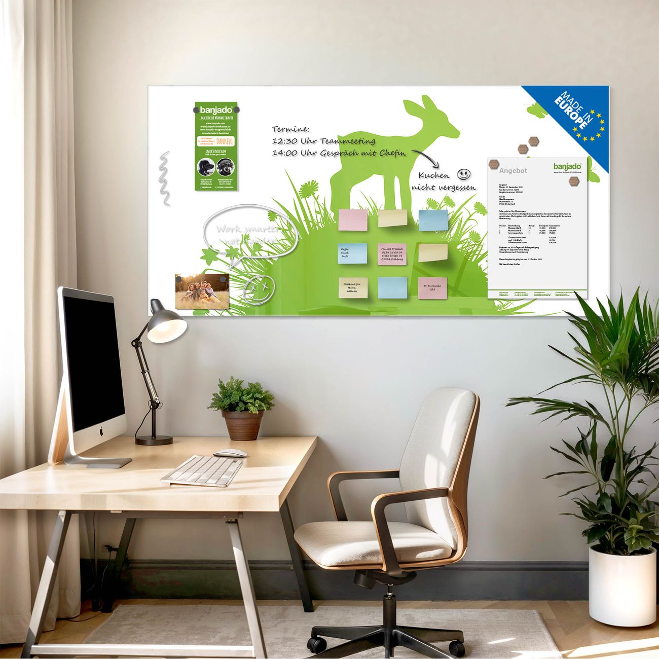 Jede Glas Magnettafel wird in unserer Werkstatt von Hand gefertigt und sorgfältig geprüft. So erhalten Sie ein echtes Qualitätsprodukt, das Funktion und Ästhetik perfekt vereint.?? Warum banjado?