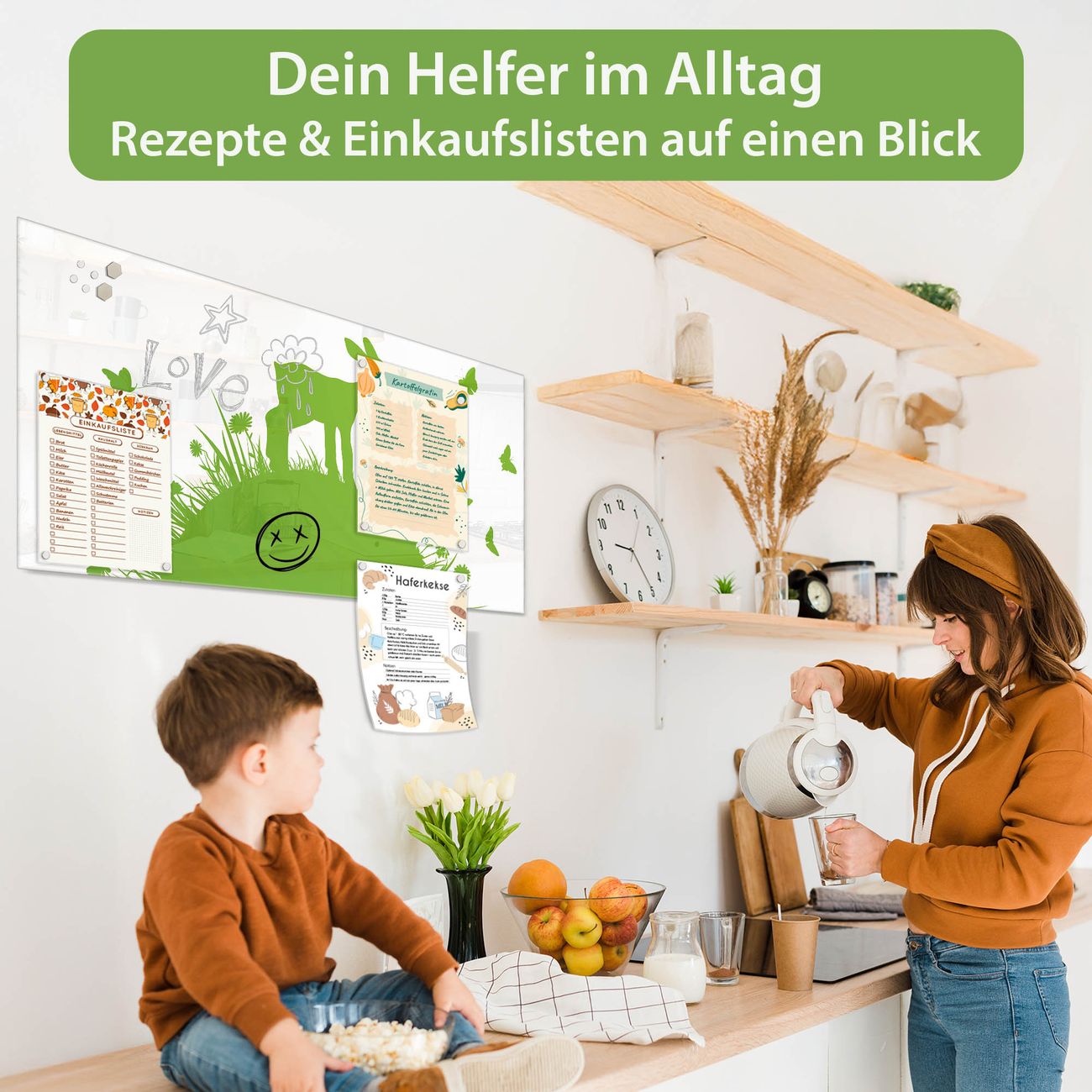 Auf der glatten Glasoberfläche lassen sich Termine, Rezepte oder Notizen ganz einfach mit Kreidestiften festhalten und rückstandslos entfernen. Starke Neodym-Magnete halten Ihre wichtigsten Erinnerungen sicher an Ort und Stelle. So entsteht Ihre ganz persönliche Ideenwand - jeden Tag neu.