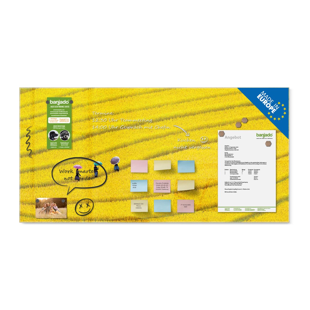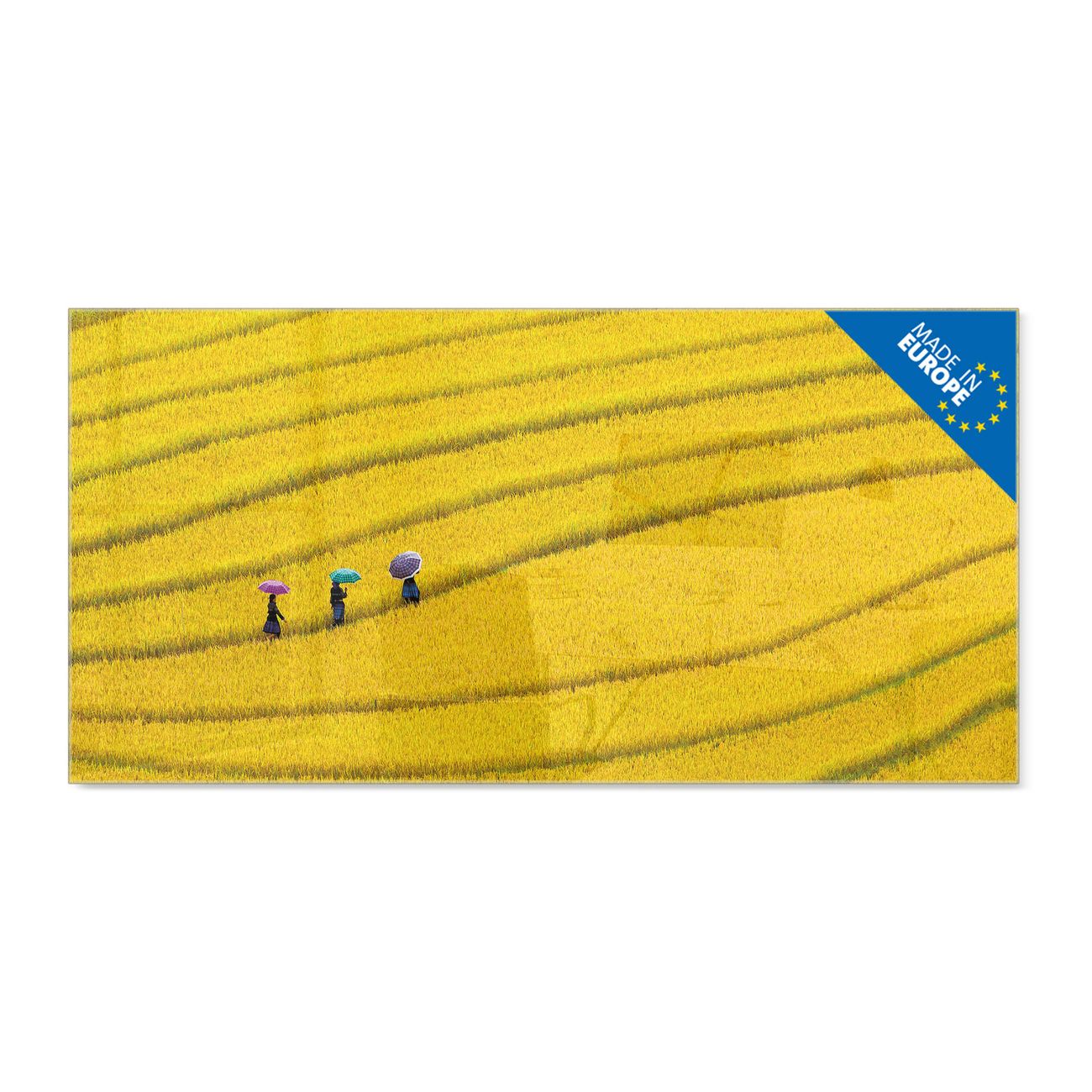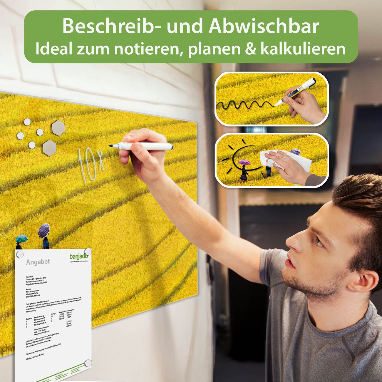 Material: 4mm Sicherheitsglas mit Metallrückwand Eigenschaften: beschreibbar, magnetisch, kratzfest Maße: 100x50x0,6cm, 7,50kg schwer Motiv Nummer 12669 Reisfeld Vietnam Zubehör: inklusive 4 Neodym-Magnete