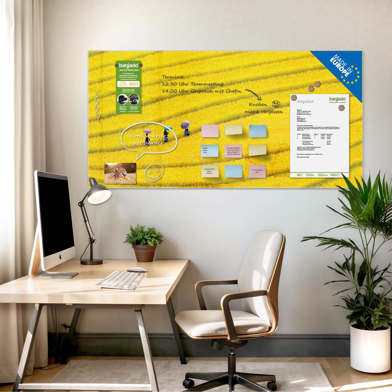 Die banjado Glas Magnettafel mit dem Motiv Motiv Reisfeld Vietnam verbindet Funktionalität mit Stil. Sie ersetzt das Zettelchaos durch klare Strukturen und bringt dabei eine warme, natürliche Atmosphäre in Ihr Zuhause. Ob im Büro, in der Küche oder im Eingangsbereich - dieses Design-Board zieht Blicke an und sorgt für Ordnung mit Charakter.