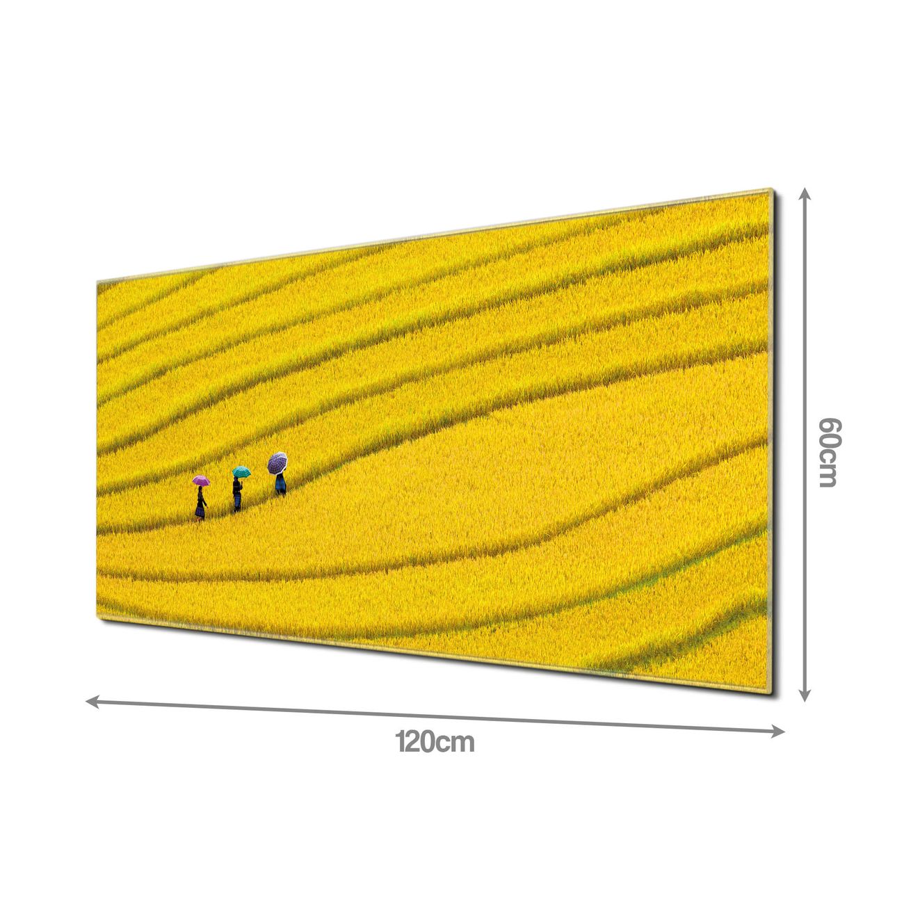 Material: 4mm Sicherheitsglas mit Metallrückwand Eigenschaften: beschreibbar, magnetisch, kratzfest Maße: 120x60x0,6cm, 10,80kg schwer Motiv Nummer 12669 Reisfeld Vietnam Zubehör: inklusive 4 Neodym-Magnete