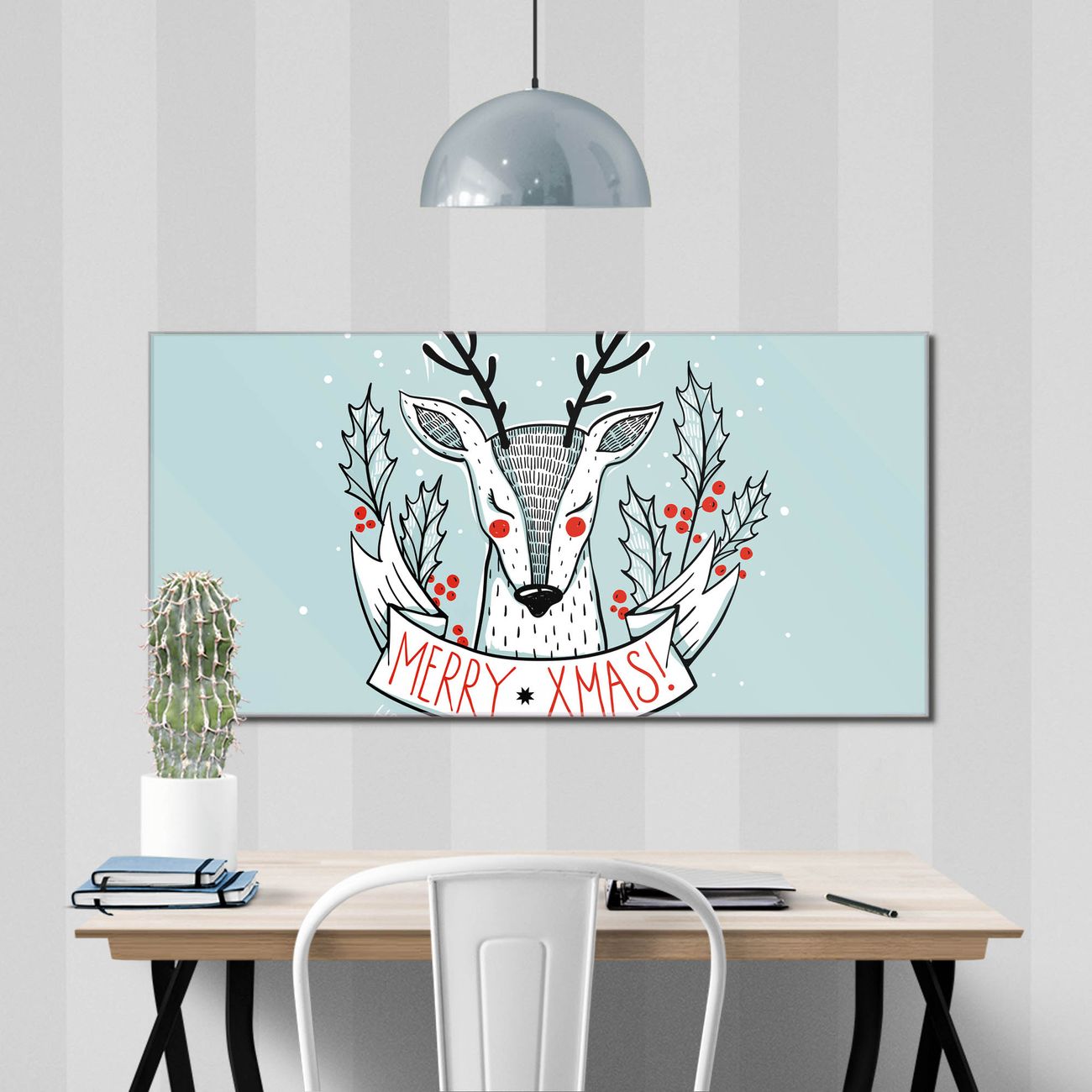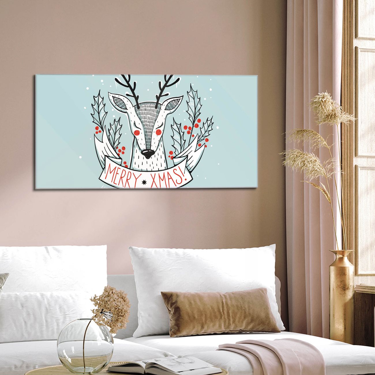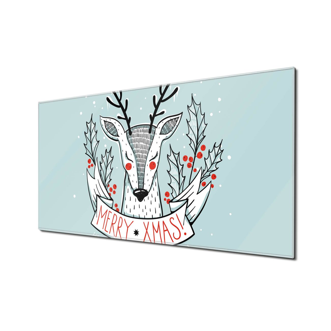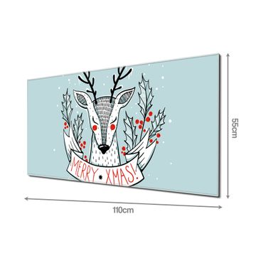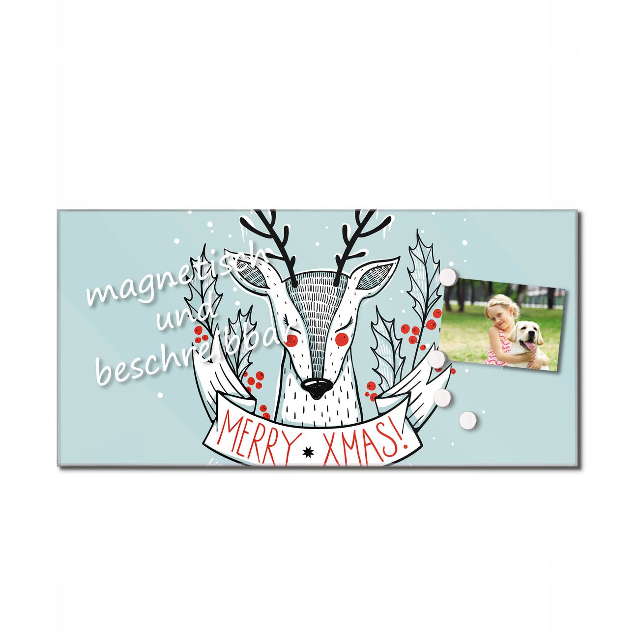 Material: 4mm Sicherheitsglas mit Metallrückwand Eigenschaften: beschreibbar, magnetisch, kratzfest Maße: 110x55x0,6cm, 9,08kg schwer Motiv Nummer 12724 Rentier Zubehör: inklusive 4 Neodym-Magnete
