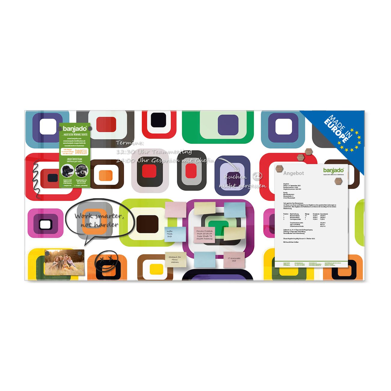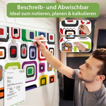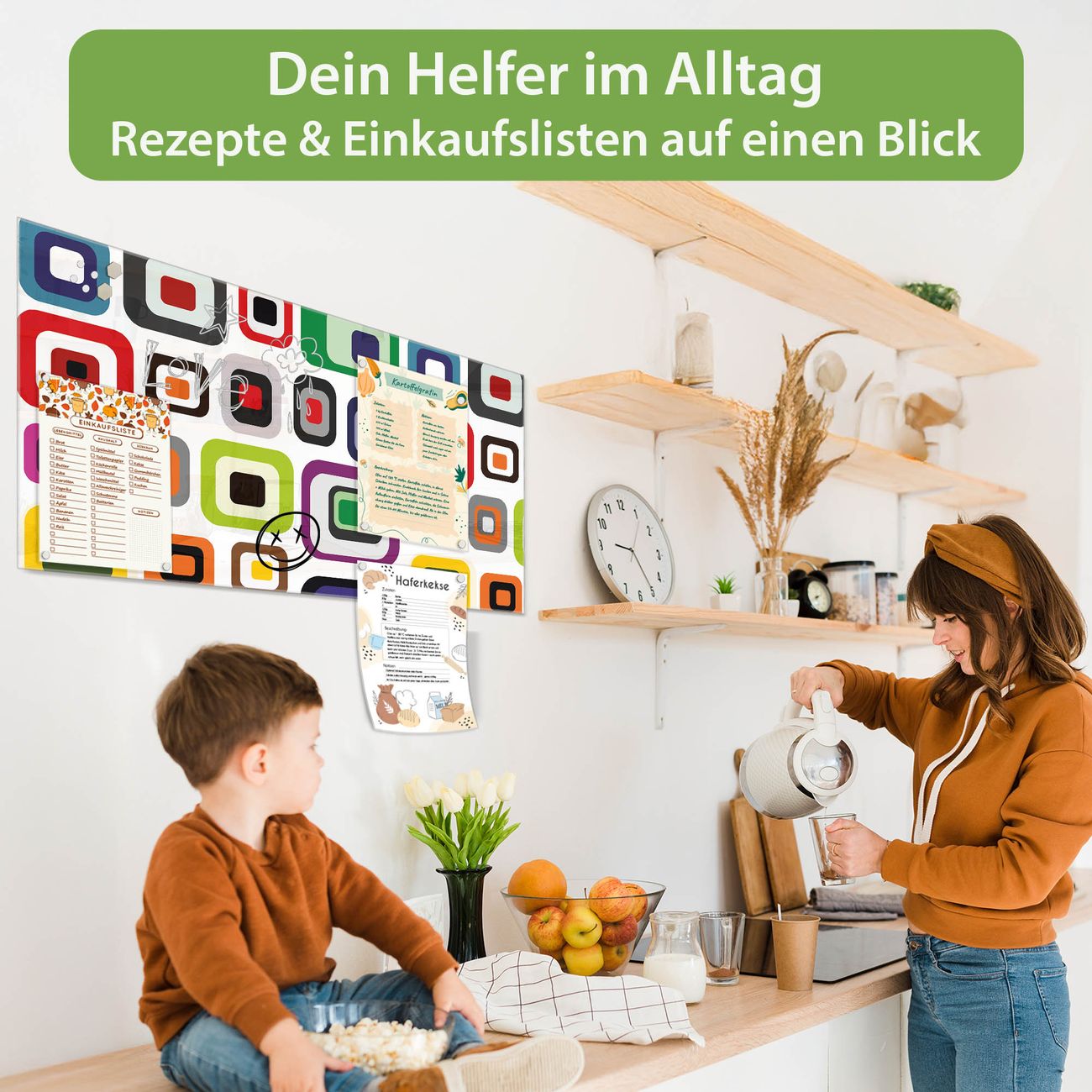 Material: 4mm Sicherheitsglas mit Metallrückwand Eigenschaften: beschreibbar, magnetisch, kratzfest Maße: 100x50x0,6cm, 7,50kg schwer Motiv Nummer 10073 Retro 2 Zubehör: inklusive 4 Neodym-Magnete