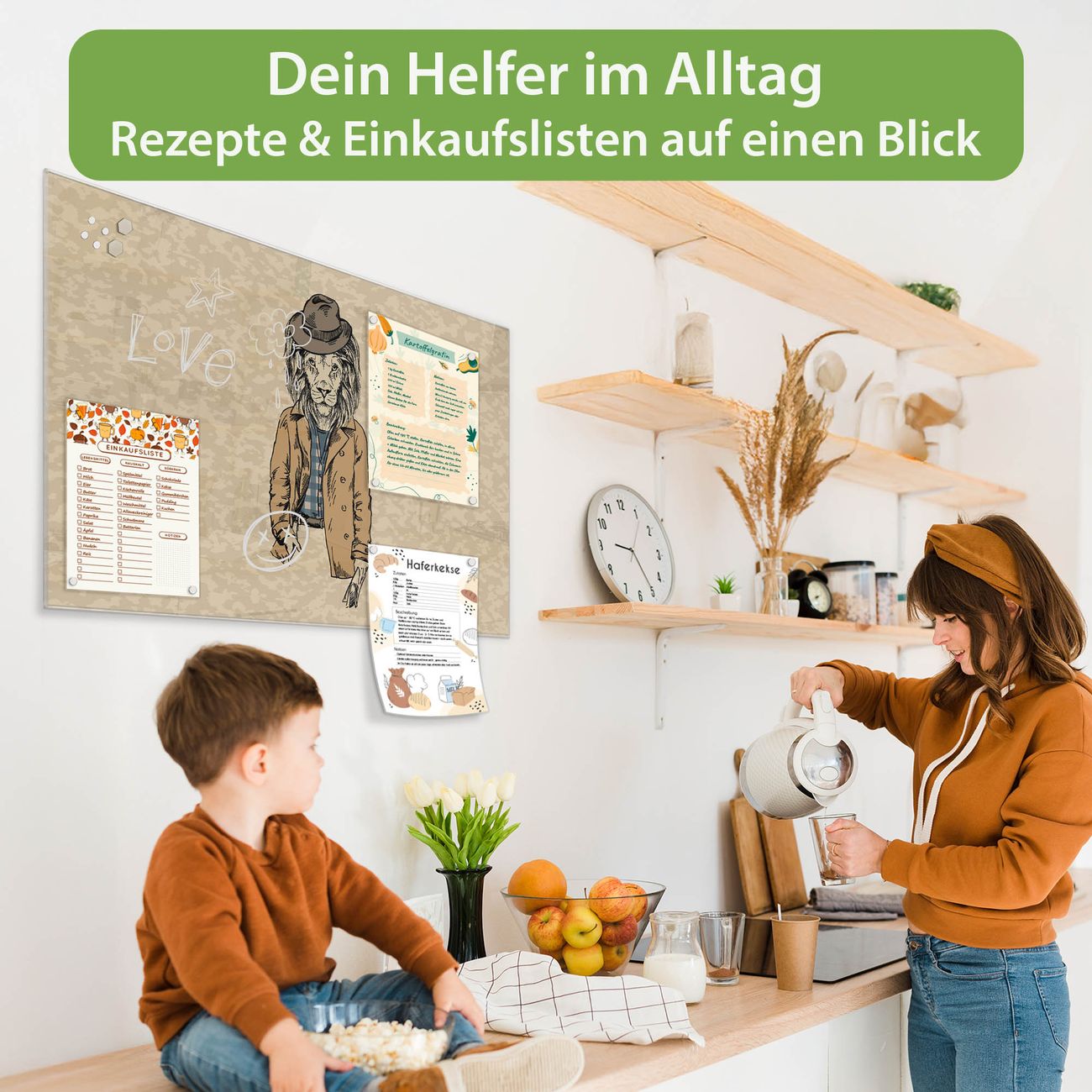 Auf der glatten Glasoberfläche lassen sich Termine, Rezepte oder Notizen ganz einfach mit Kreidestiften festhalten und rückstandslos entfernen. Starke Neodym-Magnete halten Ihre wichtigsten Erinnerungen sicher an Ort und Stelle. So entsteht Ihre ganz persönliche Ideenwand - jeden Tag neu.