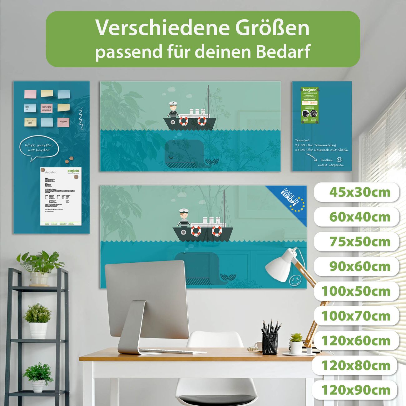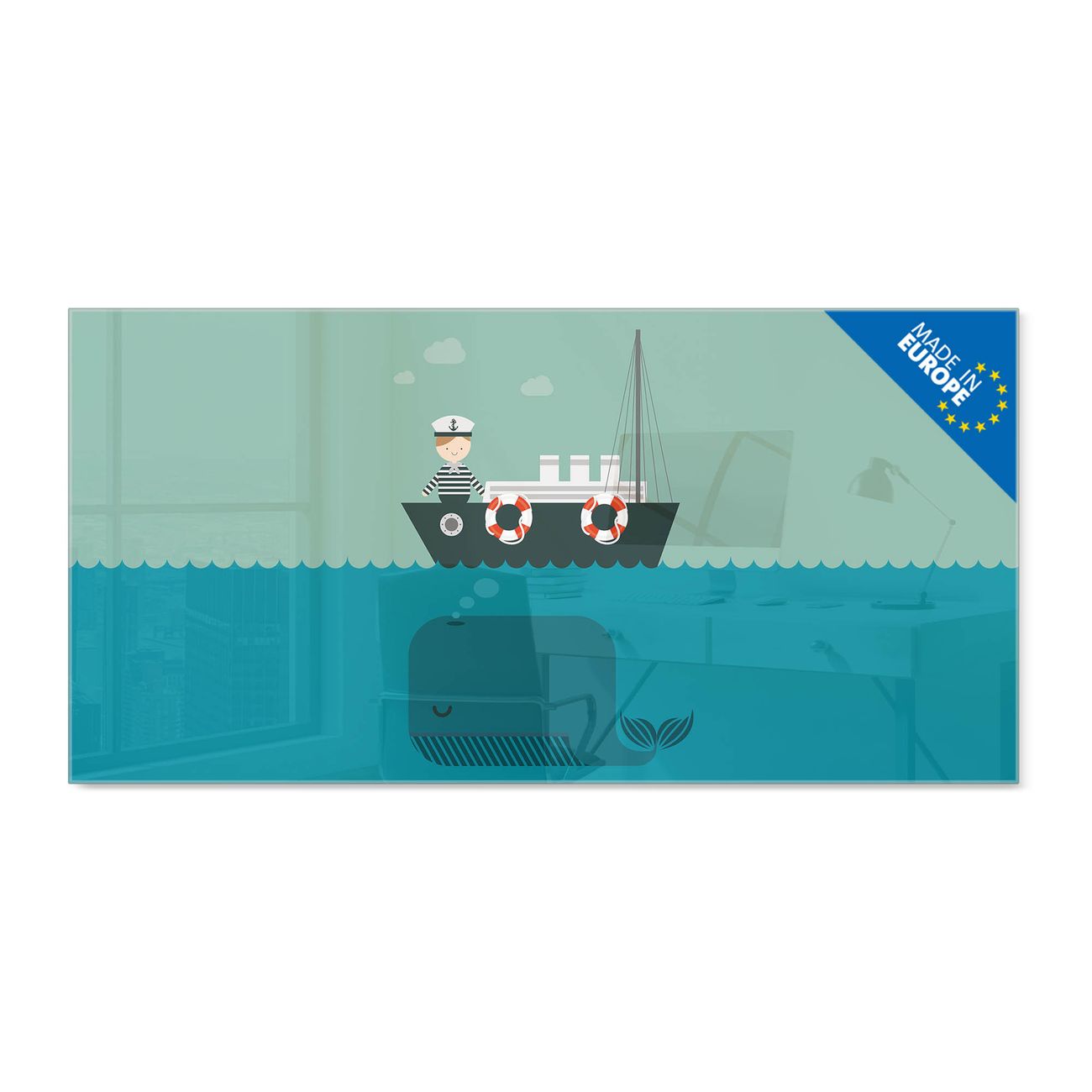 Material: 4mm Sicherheitsglas mit Metallrückwand Eigenschaften: beschreibbar, magnetisch, kratzfest Maße: 100x50x0,6cm, 7,50kg schwer Motiv Nummer 11930 Rettet die Wale Zubehör: inklusive 4 Neodym-Magnete